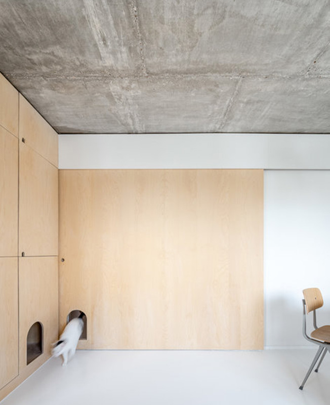 Гостиную-столовую можно закрыть раздвижной перегородкой, опять-таки из фанеры, а чтобы домашний питомец, белый кот, свободно курсировал по дому, в перегородке сделано сводчатое отверстие. Еще одно такое же отверстие — вход в домик, где кот спит.