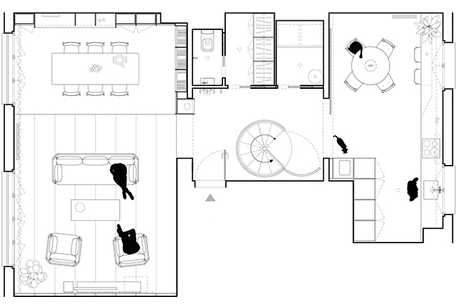 На верхнем уровне — опен спейс гостиной-столовой. Зонирование осуществляется покрытиями: голый бетон на потолке сменяется белой краской, дощатый пол переходит в наливной. В стены встроены шкафы из фанеры, вместо ручек — аккуратные выемки. Глухие отсеки разбавлены открытыми полками, на которых хозяева выставляют произведения искусства, книги, предметы декора.