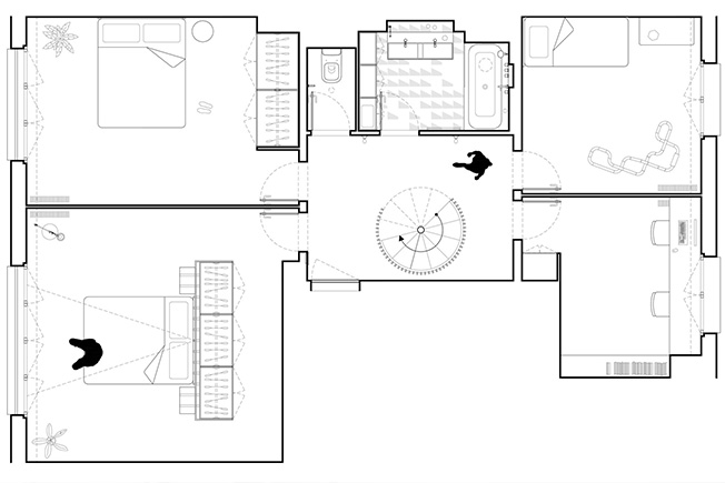 Авторам предстояло реконструировать просторную, 154 кв. метра, но запущенную двухуровневую квартиру — сделать ее более подходящей для молодых хозяев и безопасной для их ребенка. Преобразования они начали с того, что расчистили коробку: сняли полы, подвесные потолки и желтую ткань со стен — предыдущие владельцы придерживались «традиционных ценностей».