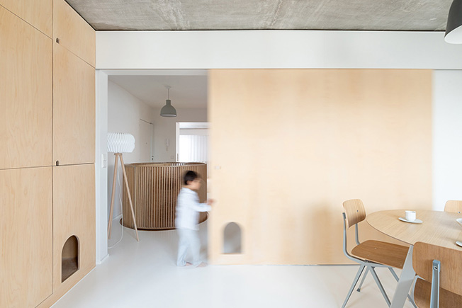 Оттенок березовой фанеры определил палитру квартиры, его дополняют серый тон бетона, а также холодный белый. Всплески цвета крайне редки, например, в столовой внимание притягивают красные, синие и желтые провода свисающей с потолка люстры. Важный источник цвета — вещи хозяев, прежде всего книги.