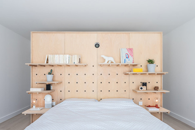 Одна из стен обшита листами фанеры с круглыми отверстиями: они выглядят своеобразным декором и дают возможность интегрировать навесные полки.