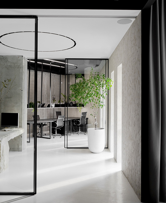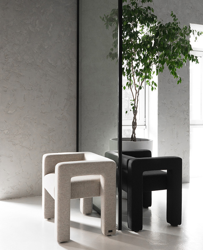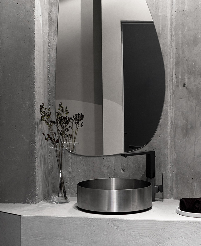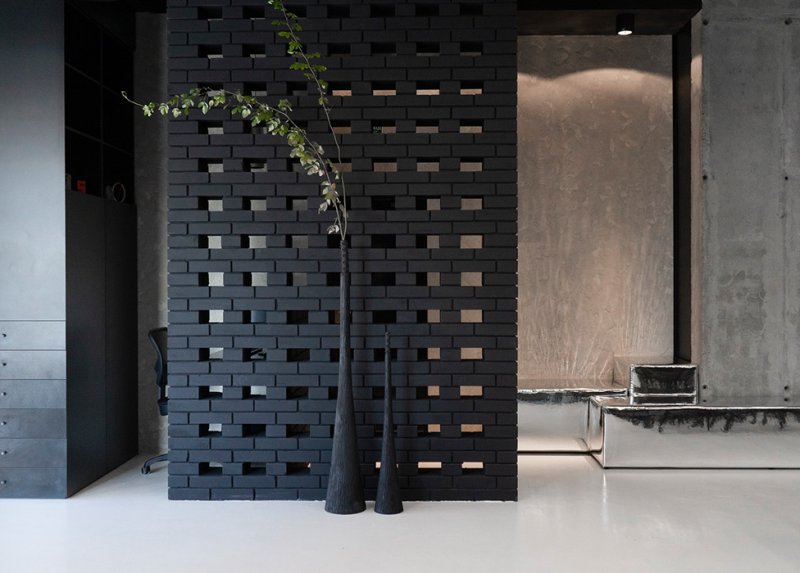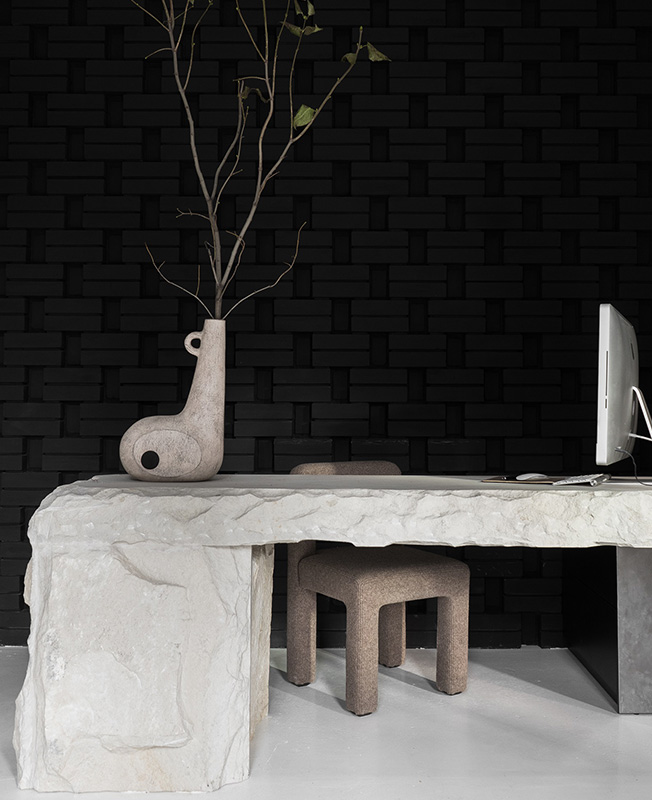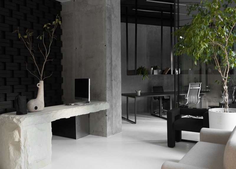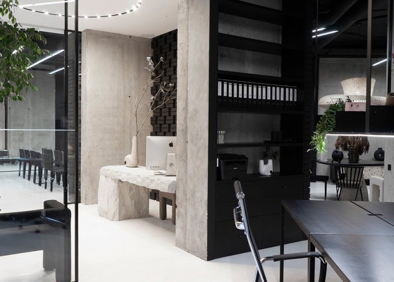 Наряду с этим автор использует в проекте микроцемент, бетон, кирпич, нержавеющую сталь. Стулья коллекции Faina изготовлены под заказ из эко-состава (солома, лен, хлопок, биополимер). В перегороворной зоне — массивный стол из цельной глыбы песчаника