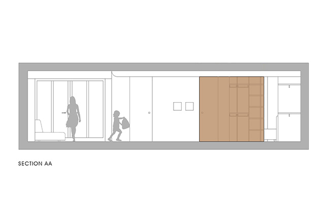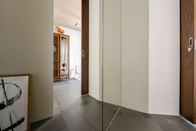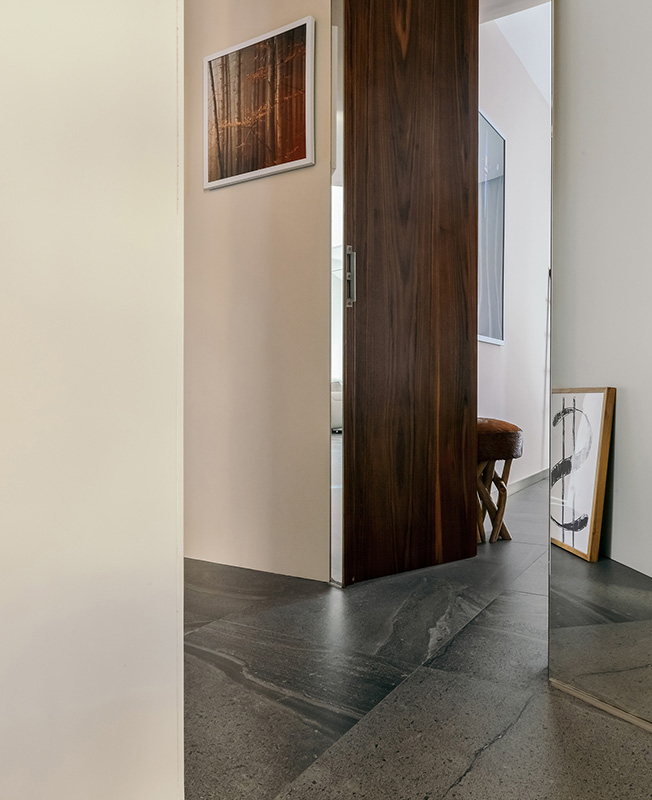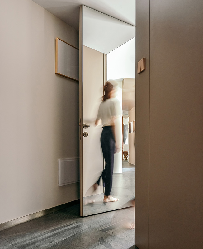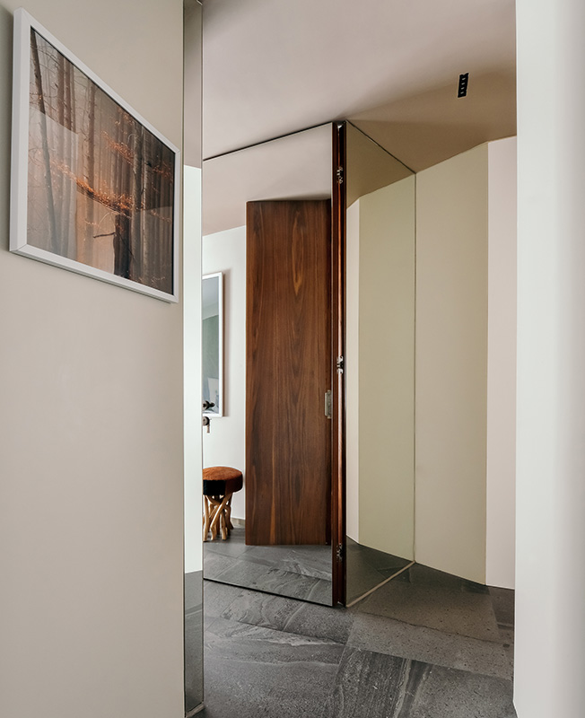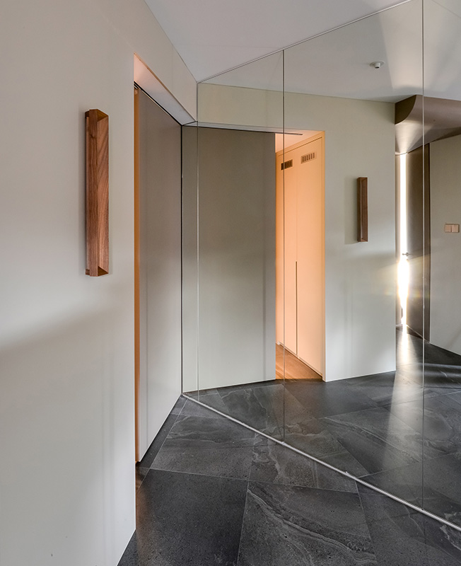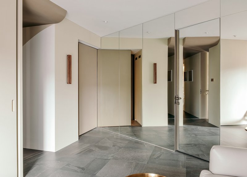 В самом большом помещении мы установили под точно высчитанным углом систему шкафов и зеркал, она же стала стартовой точкой для раздвижной дверь в кухню. Это не только изменило отношения между гостиной, кухней и столовой, но также существенно расширило пространство и добавило значительное количество непрямого света. Раздвижная дверь перемещается, отражаясь в зеркалах — реальный мир взаимодействует с параллельным.