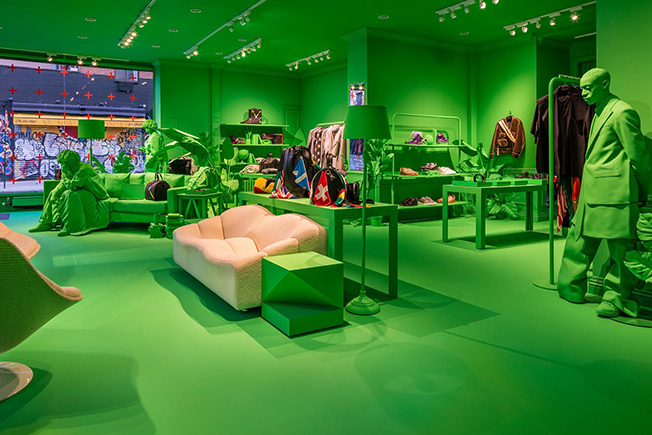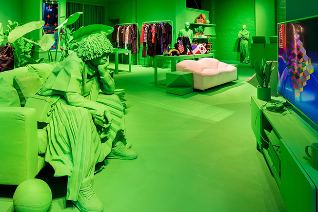 Pop-up магазин находится по адресу 100 Rivington Street. Фасад, стены, пол, потолок, манекены — всё залито в неоновый зеленый. В таком запоминающемся окружении представлена осенняя коллекция мужской одежды 2019 года, созданная Вирджилом Абло.