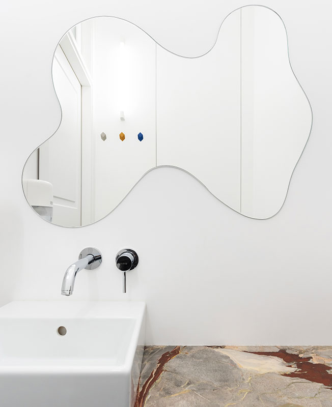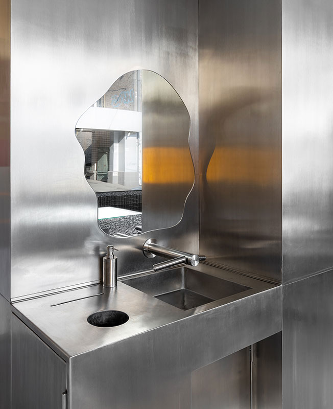 Мотив деконструкции в строгое пространство вносят аморфные зеркала, силуэт которых повторяется в столиках на компактной открытой террасе заведения.