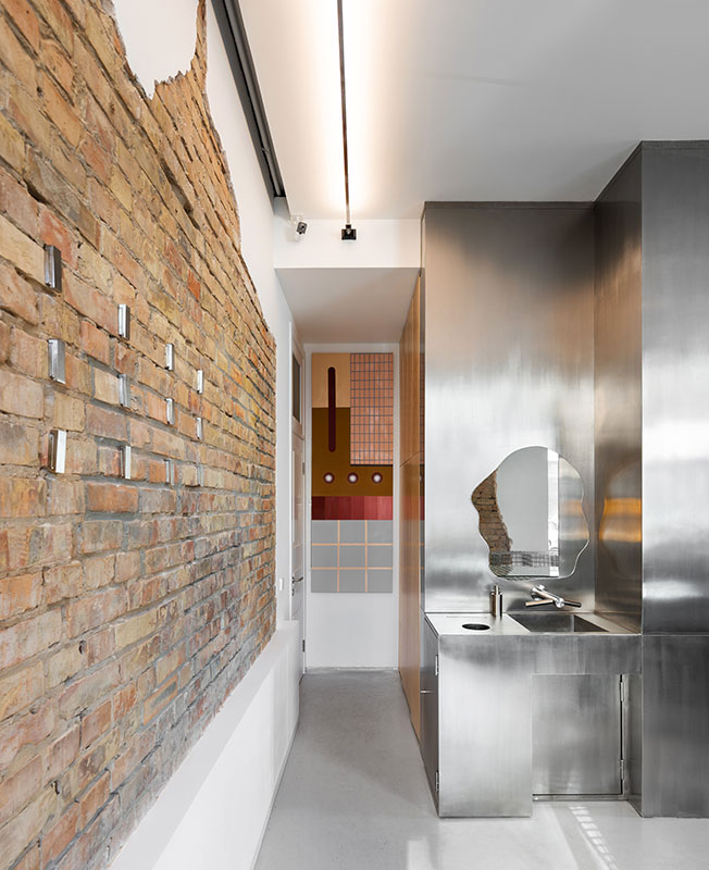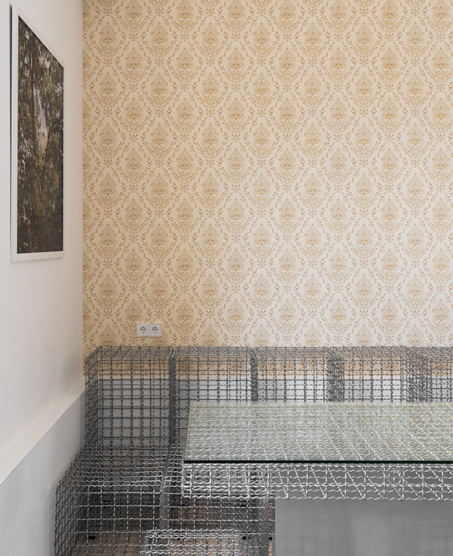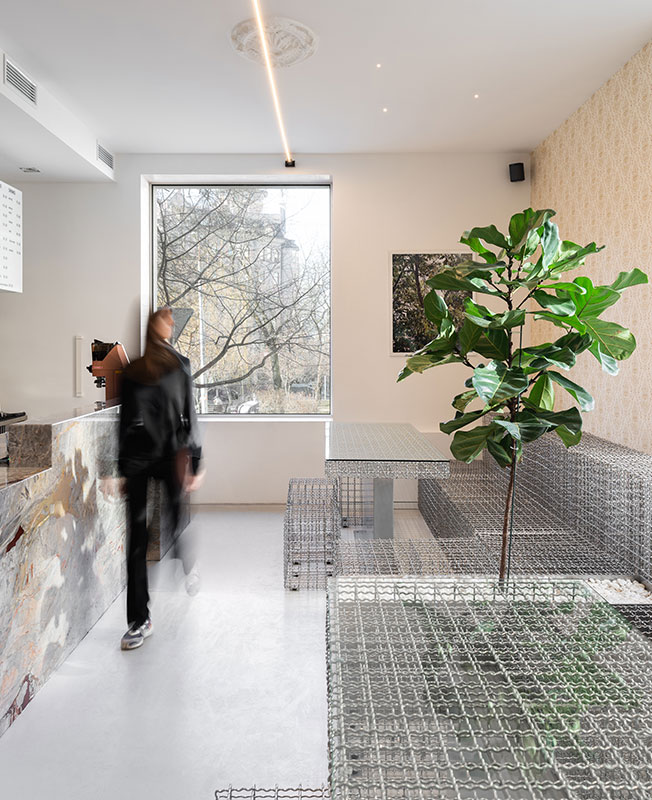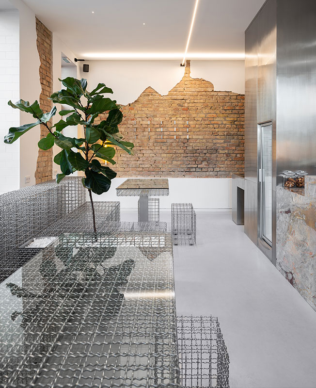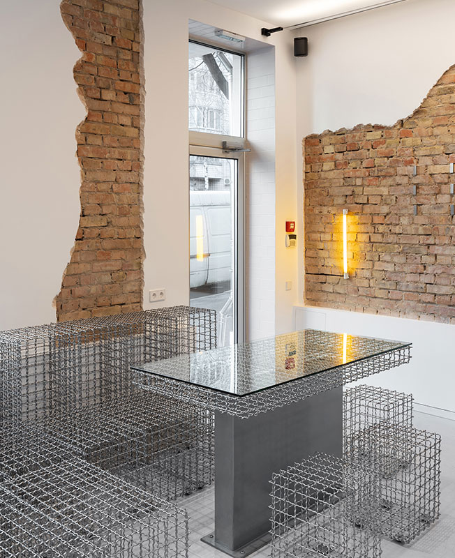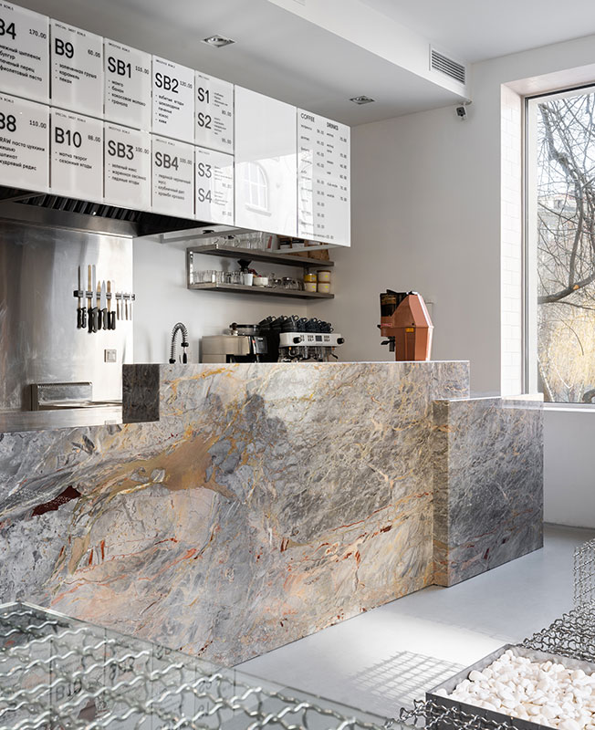 Смыслообразующим элементом дизайна стала металлическая сетка. В интерьере она играет роль посадочных мест, при этом объекты не перегружают пространство. Также в интерьере применили натуральный мрамор в отделке барной стойки и нержавеющую сталь в оформлении санузлов.