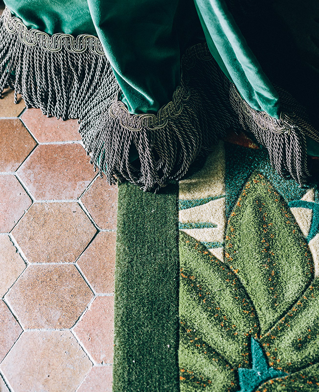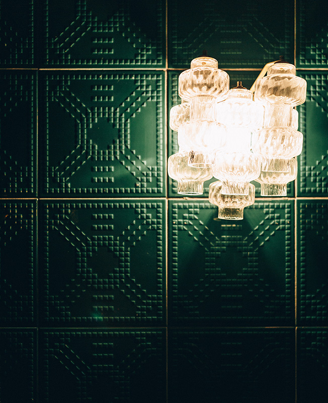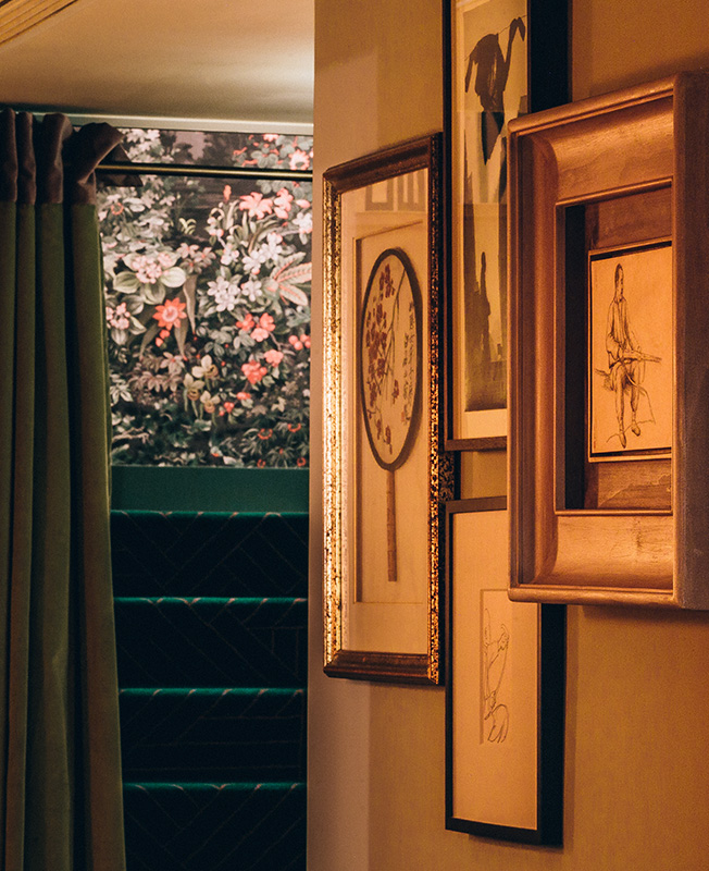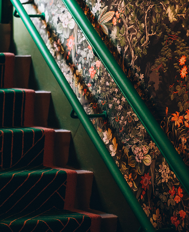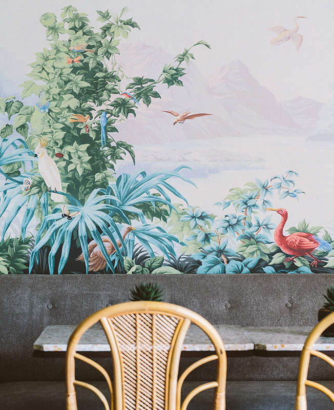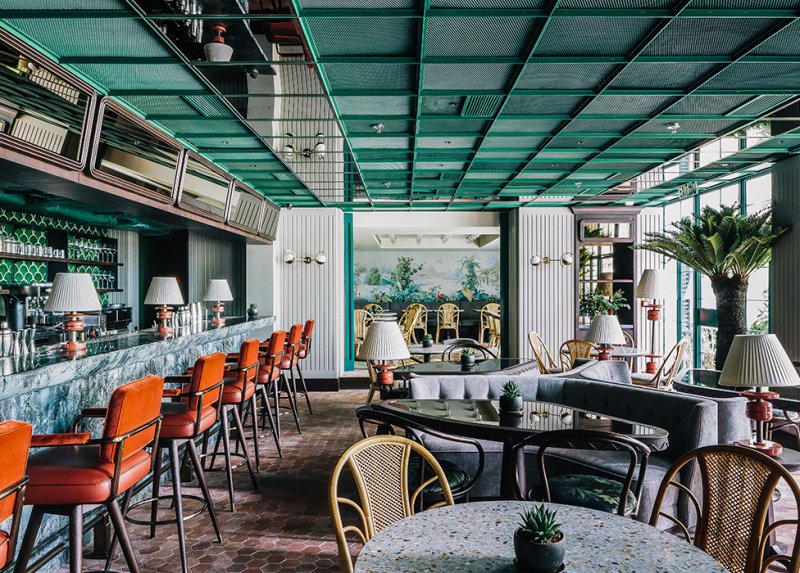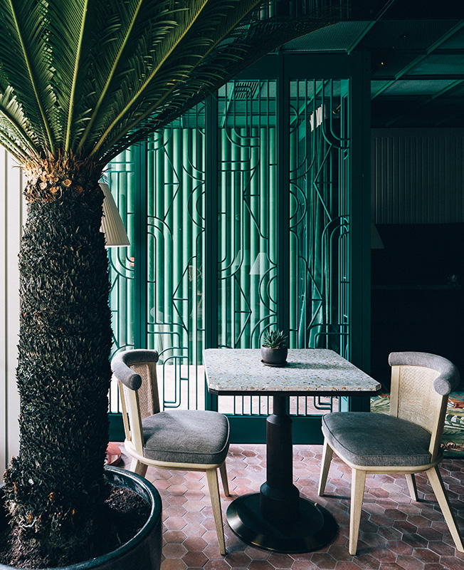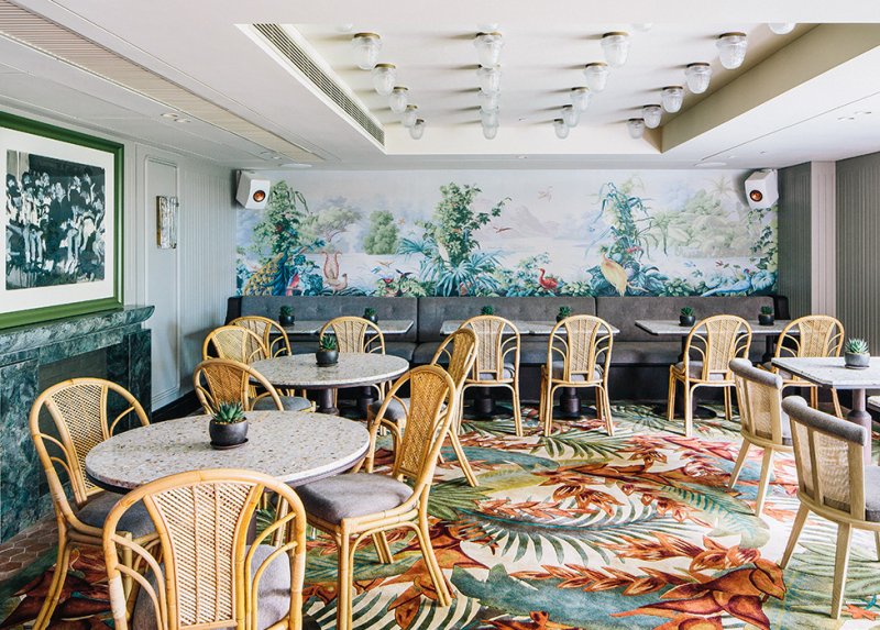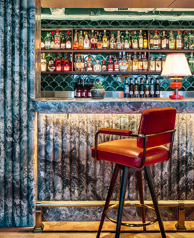 Войдя в Parlour на первом этаже, можно обнаружить стулья Thonet, местную мебель из раттана, обилие оттенков зеленого, сделанные на заказ угловые диванчики, лампы с плиссированными абажурами, барные стулья в апельсиновой коже — интерьер отражает эклектичный вкус Луизы. Во всю длину комнаты простирается барная стойка из мрамора. Материалу придан рельеф, напоминающий драпировки — подобный мотив можно встретить и в других местах ресторана.