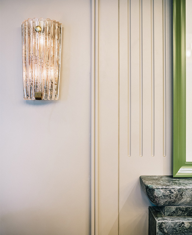 Старинные настенные светильники обозначают вход в «Гостиную», которая легко превращается в отдельную комнату для особых мероприятий. Ее стены и пол декорированы сценами тропического рая — обоями и ковром ручной работы.