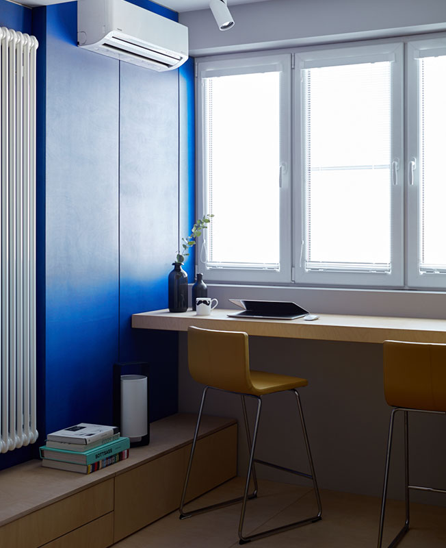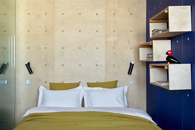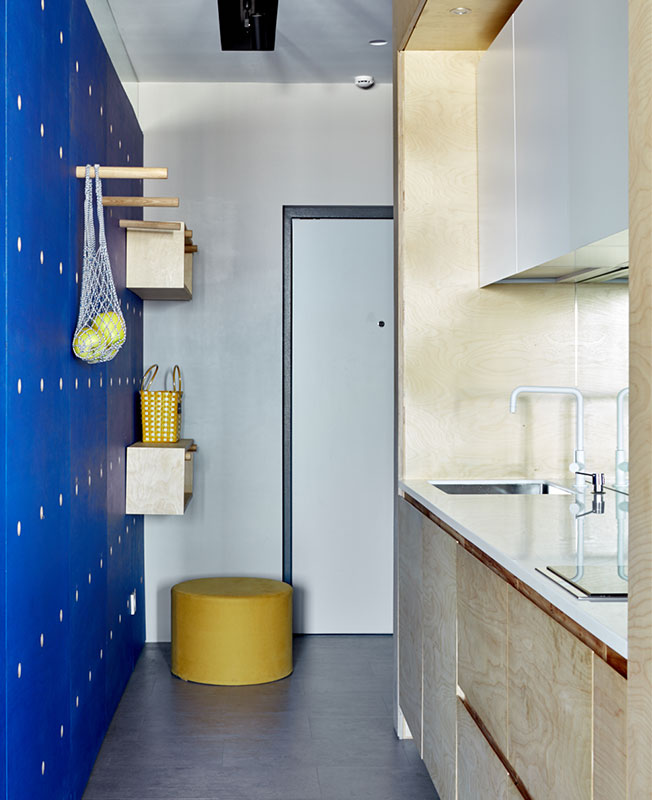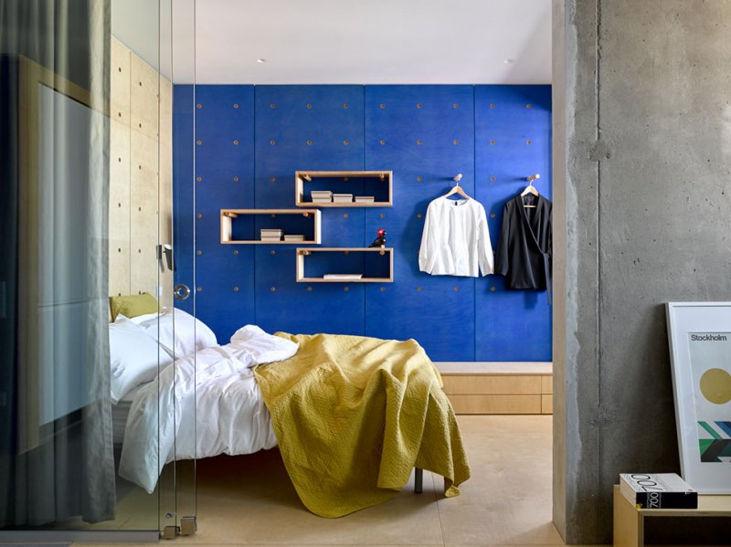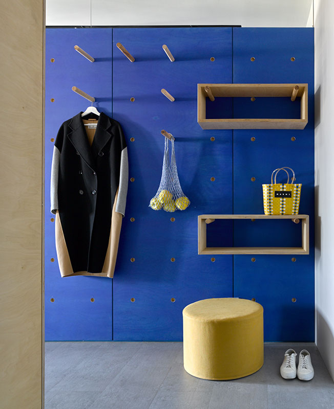 Объединяющим элементом всего пространства стала березовая фанера в двух цветах — натуральном и насыщенном синем. Две зоны (спальня и прихожая) оформлены панелями с просверленными отверстиями, в которые можно вставлять деревянные штыри, на которые в свою очередь можно навесить полки-модули или вешалки с одеждой. Решение напоминает игру в конструктор, а зоны легко адаптируются под необходимые задачи.