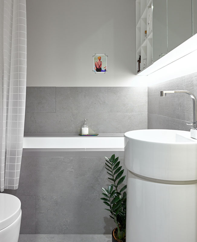 Во втором кубе оборудовали санузел со входом из прихожей. По внешней стороне объема расположилась кухня, которая по замыслу застройщика должна была находиться в существующей спальне с балконом. Проем между комнатами существенно расширили и вместо стандартной двери установили сдвижную стеклянную перегородку.