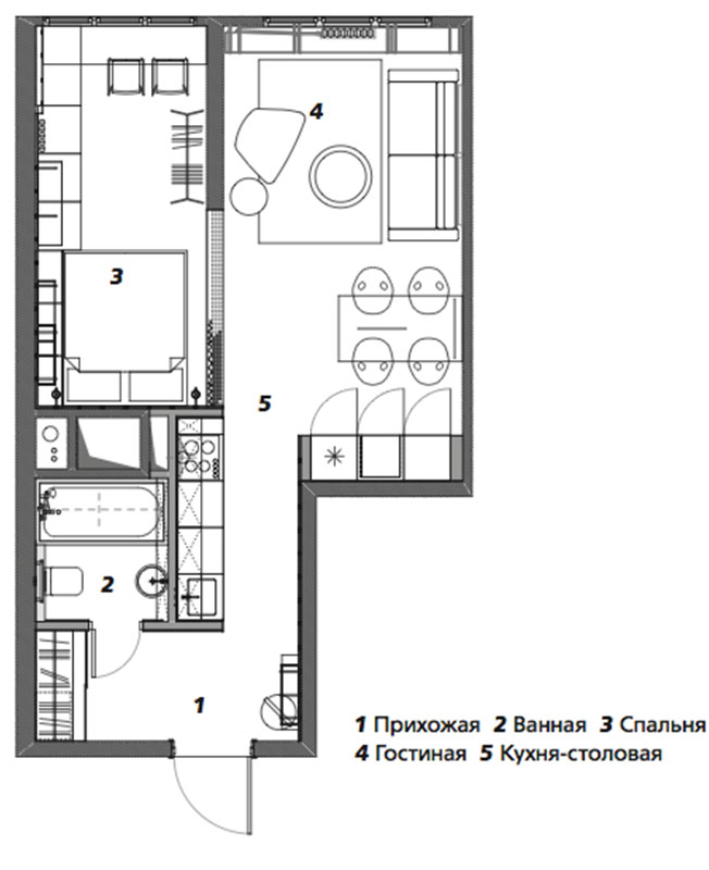 Самым главным этапом реализации проекта стало полное переосмысление пространства. Единственная жилая комната превратилась в функциональную просторную гостиную-столовую.