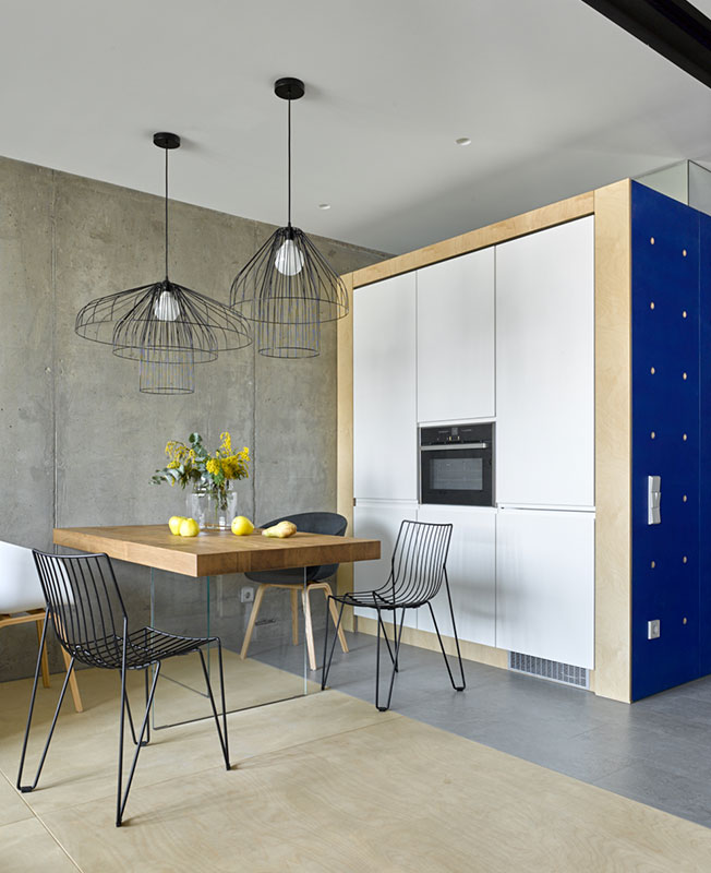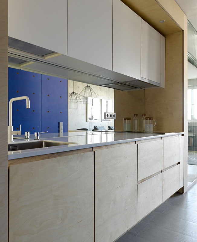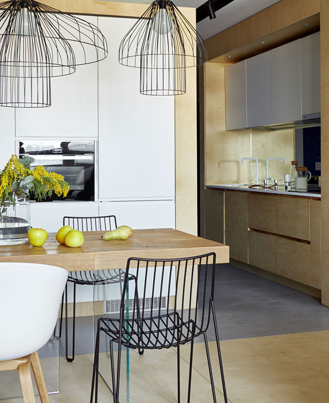 В квартире дизайнер создала два фанерных объема. Один из них – всего лишь визуальная обманка. В стену за обеденным столом встроена часть кухни: холодильник, система хранения, духовка. Создается впечатление, что за одной из дверей находится проход в потайную комнату, но пространство за фасадами — это уже квадратные метры соседей.