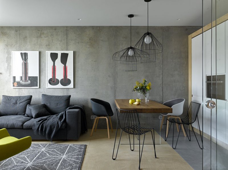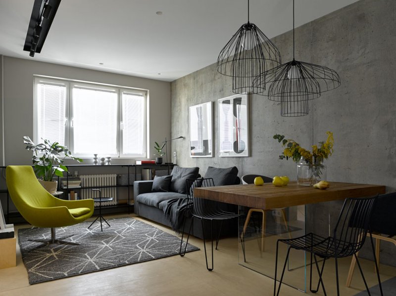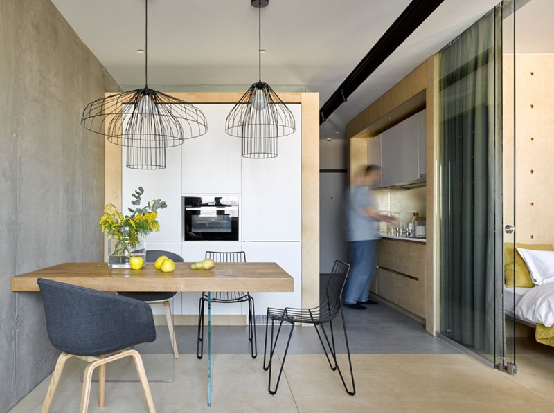 Стандартная однокомнатная квартира в новостройке продавалась без отделки. Однако интересная фактура необработанных бетонных стен стала ключевым элементом будущего интерьера. Вторым концептуальным материалом проекта дизайнер выбрала теплую березовую фанеру, контрастную холодному лаконичному бетону.