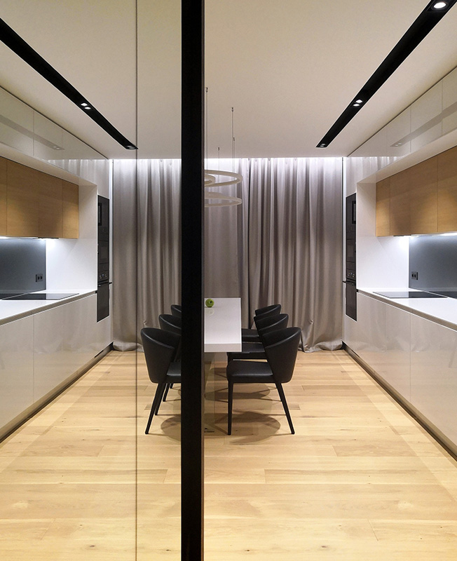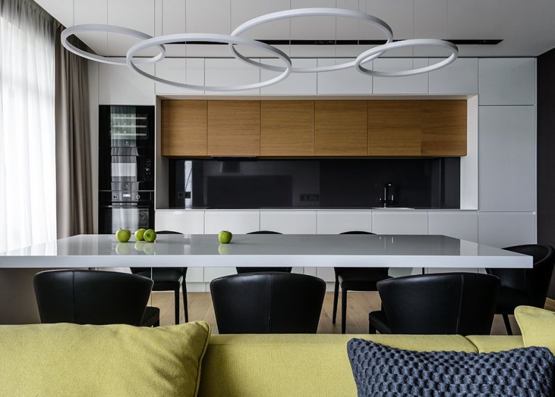 Композиция кухни линейная, симметричная с одной стороны встроен холодильник, а с другой — духовой шкаф, микроволновка, а также небольшой винный шкаф, который пришлось перетянуть черной пленкой, чтобы он гармонировал с другими приборами.