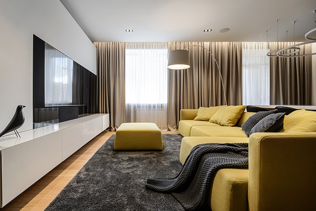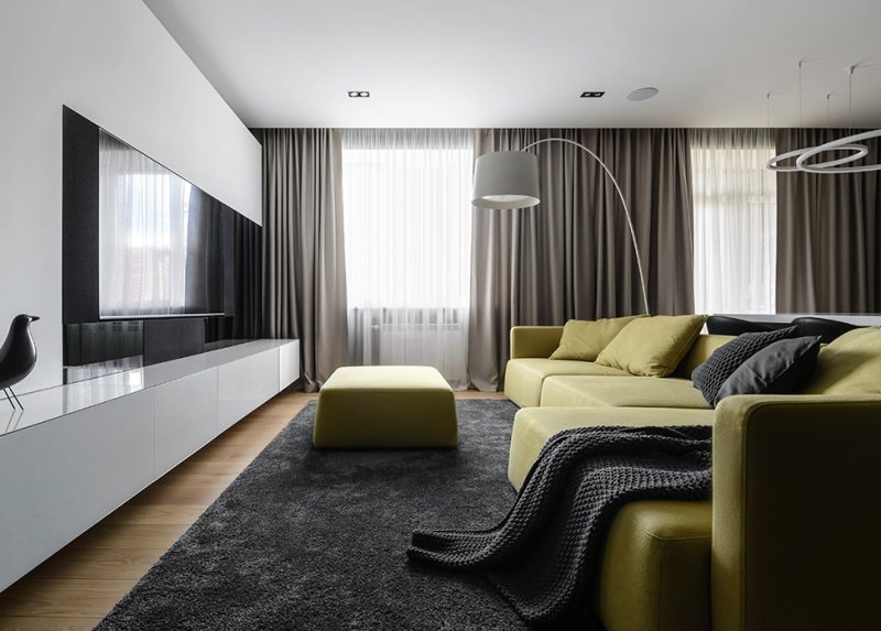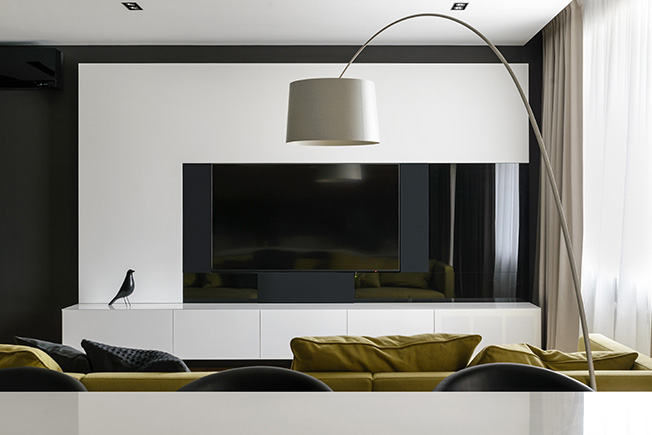 Телевизор и акустика в гостиной встроены в плоскость белой стены. Сабвуфер и дополнительное оборудование — спрятаны в навесном шкафчике. Это сделано для того, чтобы свести к минимуму присутствие технических элементов. Телевизор изначально был куплен с серебристой рамкой. Казалось бы мелочь, но для авторов она стала была серьезной проблемой — терялся смысл задуманного. К счастью, удалось найти мастеров, которые перетянули его черной пленкой.