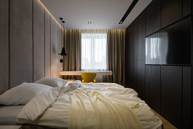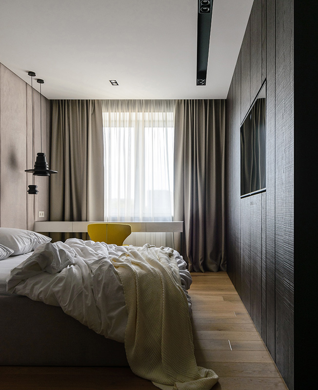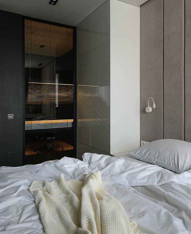 Рядом со спальней располагается гардеробная, в которой по настоянию заказчика разместили рабочий стол — получился кабинет. Через стеклянную перегородку из спальни в него проникает естественный свет. При желании можно закрыться горизонтальными жалюзи и никому не мешать.