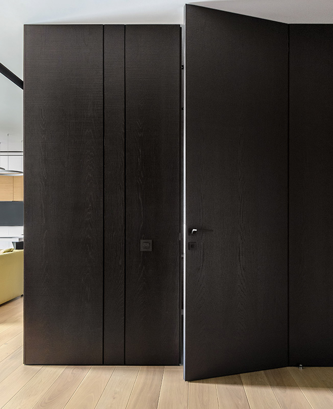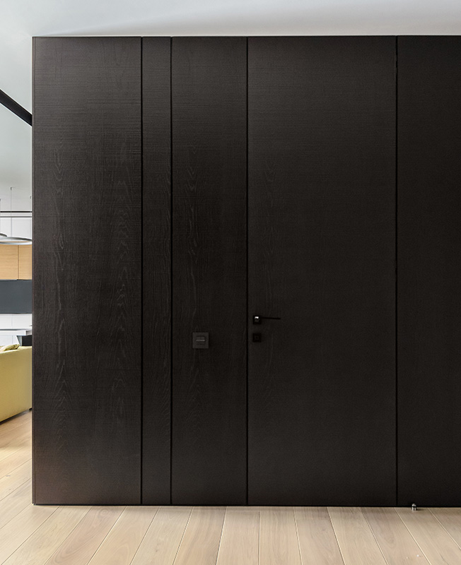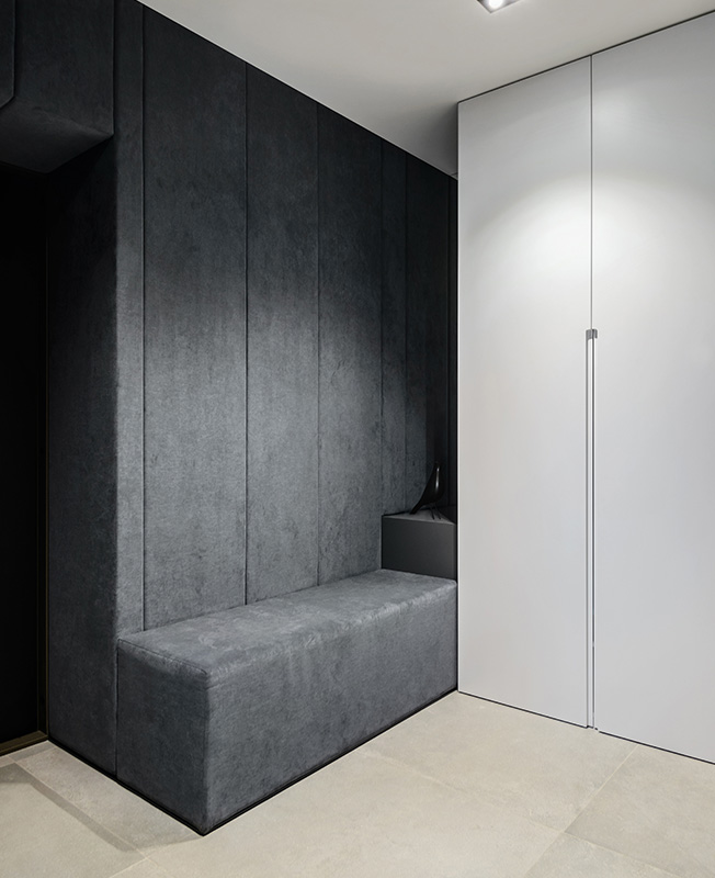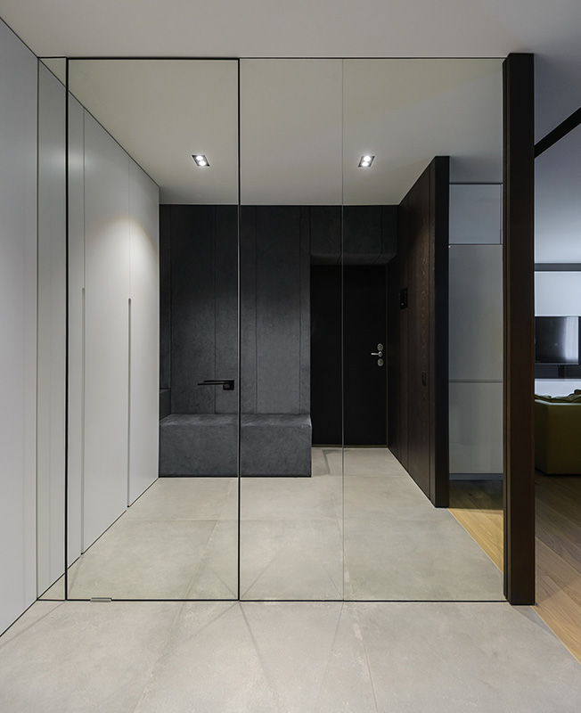 Стена при входе в квартиру отделана зеркальными полотнами, в нее интегрирована скрытая дверь в гостевой санузел. Благодаря зеркалам прихожая выглядит в два раза больше, чем есть на самом деле.