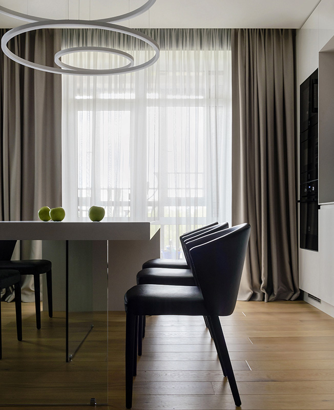 Многое выполнено по эскизам авторов проекта: корпусная мебель, кухня, кровати. Обеденный стол спроектирован из акрилового камня со стеклянными опорами. Туалетный столик в спальне — тоже на стеклянной опоре, он как будто парит в воздухе.