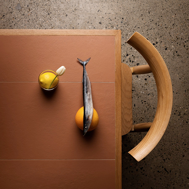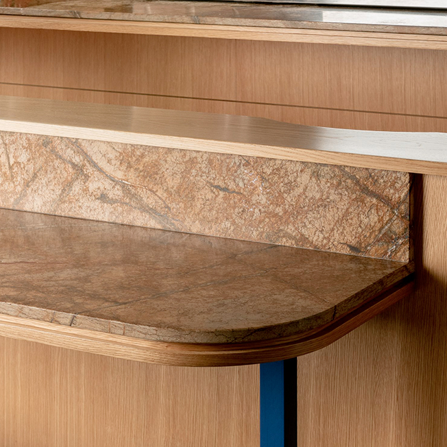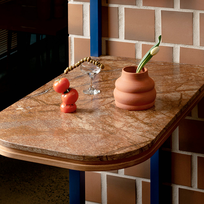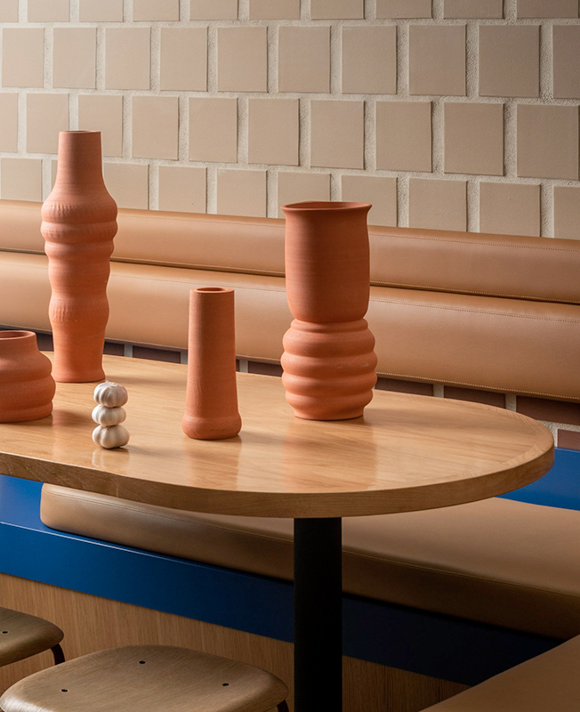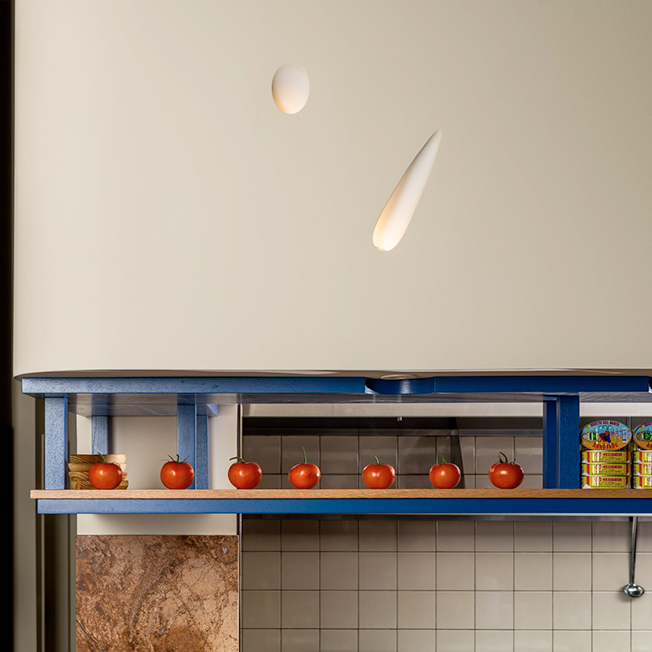 Цветовой гамме соответствует даже посуда. Ее округлые формы также являются данью творчеству Жана Арпа, поэта, художника, графика и скульптора. Его влияние можно заметить и в абстрактных картинах, украшающих бар. Приглушенные земные тона оживляют элементы в кобальтово-голубой цвете в духе работ Жоана Миро-и-Ферра — каталонского художника, скульптора и графика.
