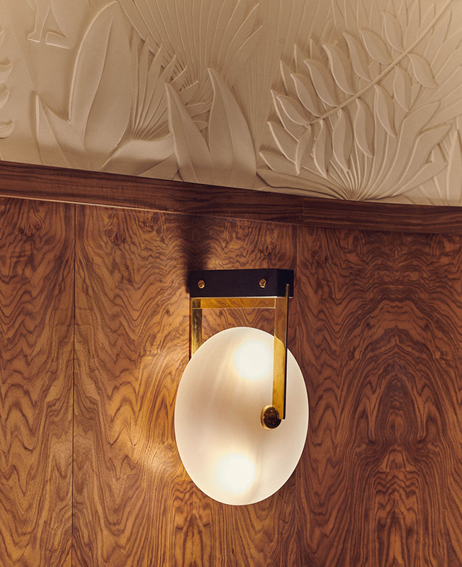 Важную роль играют панели из ореха на стенах. Они выполнены из единого ствола — знаменитого в Англии 300-летнего дерева из Фалбека, упавшего во время урагана 2007 года. То есть специально для проекта деревья не вырубали — этот факт говорит об экологической ответственности владельцев отеля и дизайнера.
