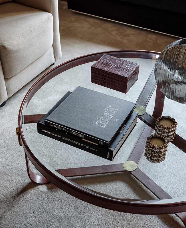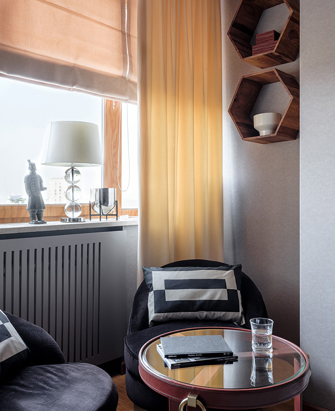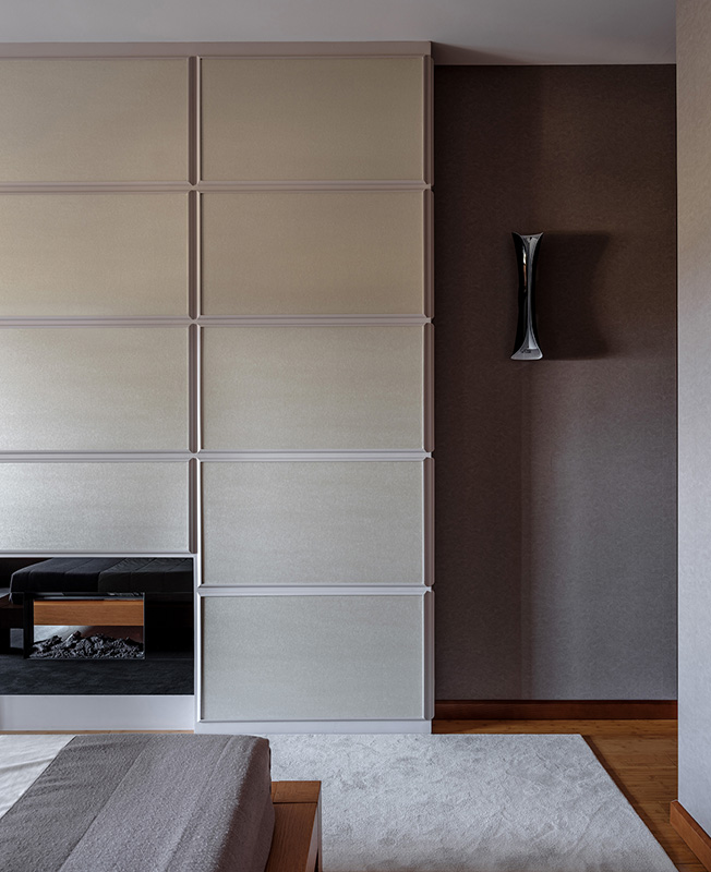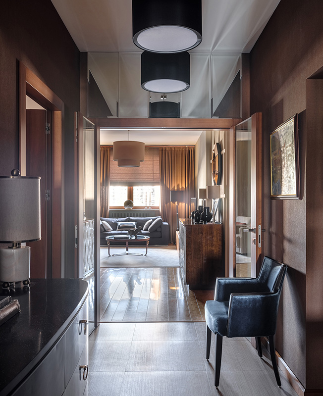 Изначально во всей квартире были двери высотой всего два метра. Дизайнер визуально увеличила их при помощи зеркал, которые расположили над проемами. Часть стен в проходной гардеробной — тоже зеркальные. Тем самым дизайнер сделала пространство светлее и просторнее.