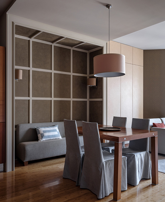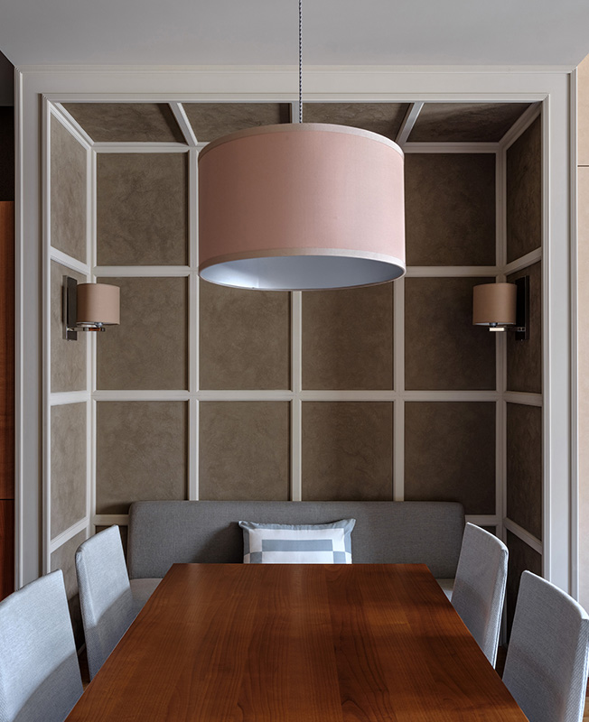 Зонирование подчеркнули разницей фактур. Если в гостиной обои Lizzo, которые меняют цвет при разном освещении (как говорит дизайнер, «хамелеонят»), то в столовой — декоративная штукатурка с фактурой замши (Safari из Hall Decor ) и слегка оттонированный потолок.