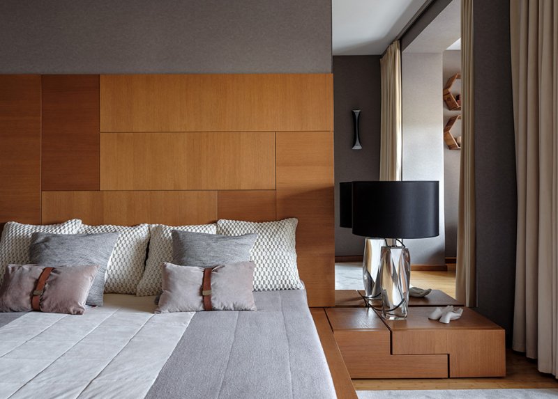 В спальне добавили гардеробную и выделили небольшой кабинет. Слева и справа от изголовья разместили зеркала, чтобы визуально увеличить комнату. На стенах обои Grandeco, имитирующие кожу. Они хорошо гармонируют с паркетом из бамбука, который заказчики просили оставить в спальне и гостиной.