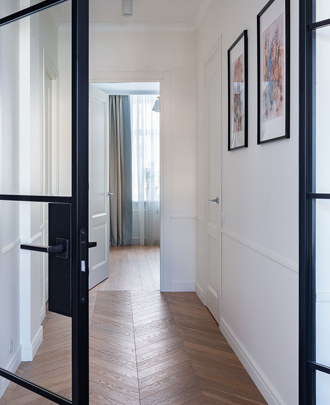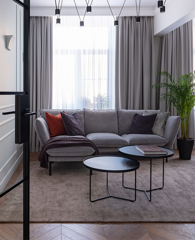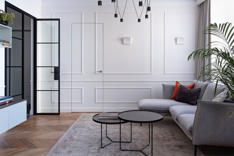 «Организация проходной гостиной стала особенно удачным решением, — рассказывает дизайнер. — В помещение выходят четыре двери, одна из которых скрытого монтажа и полностью сливается со стенами, а остальные — прозрачные стеклянные».