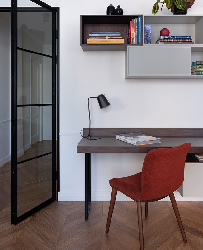 Дизайнер решила привнести в квартиру элементы французского интерьера. На полу — классический паркет «елочкой», в том числе и в зоне кухни. Стены выкрашены лаконичными красками Little Greene и Benjamin Moore, за исключением детских — в них частично применили обои.