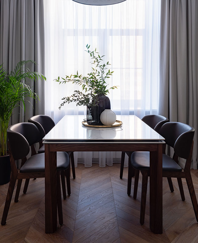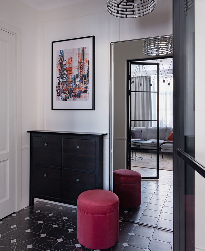Основой дизайн-концепции стало не выходящее из моды сочетание черного и белого, которое придает квартире атмосферу парадности, а натуральные оттенки создают ощущение тепла и уюта.