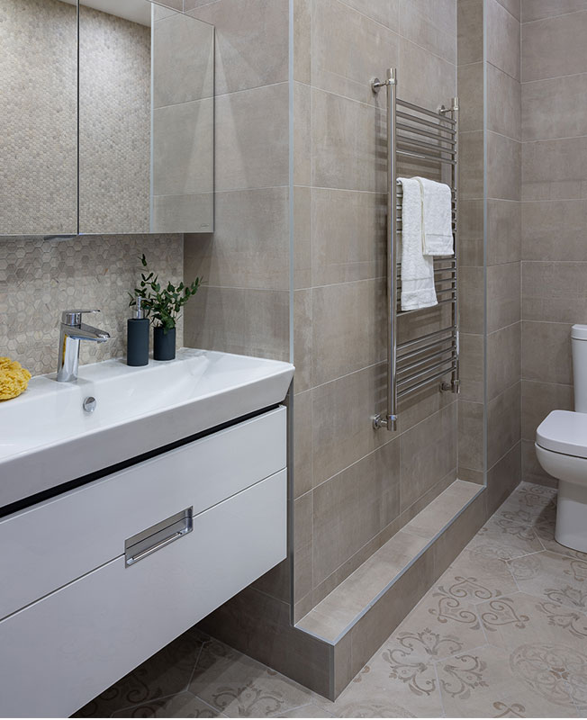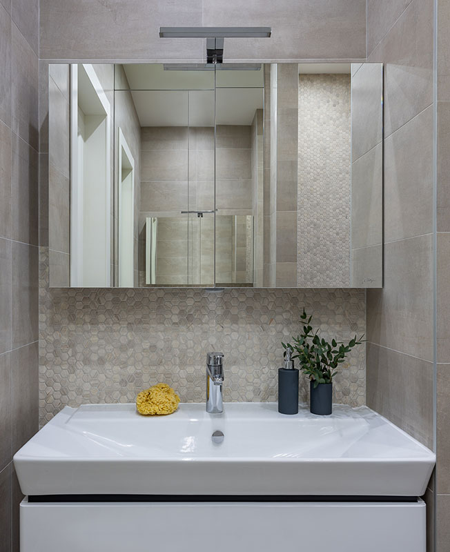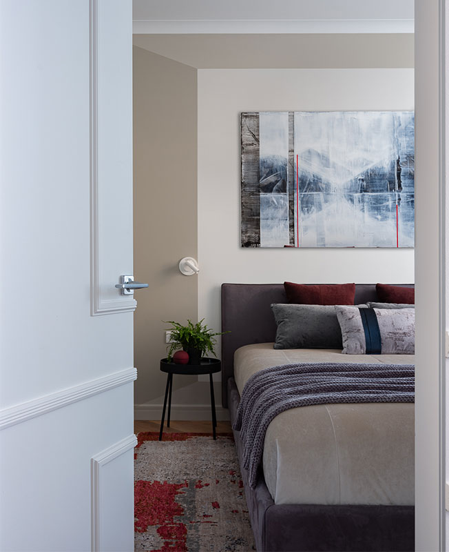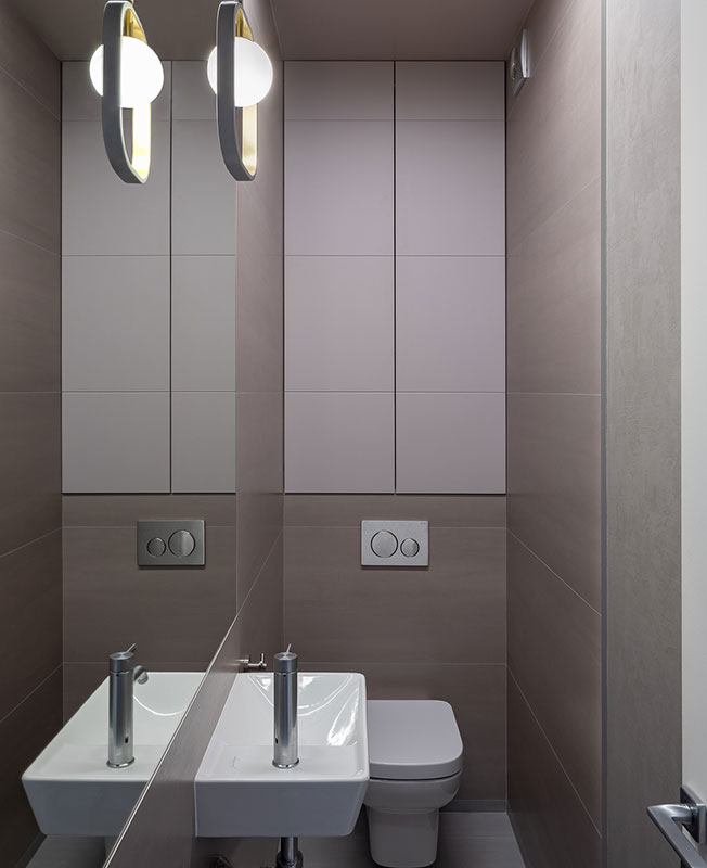 Нашлось в квартире место для гостевого санузла и просторной ванной с постирочной. Помимо двух гардеробных комнат, которые были организованы на месте бывшего коридора, в главной спальне также оборудовали антресоль для хранения редко используемых вещей — новогодней елки и удочек хозяина.