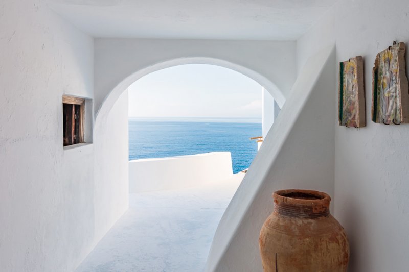 Вилла, растянувшаяся на отроге отвесной скалы, спускающейся к морю, появилась в результате переоборудования трех традиционных беленых домов в один, площадью 235 кв. метров.
