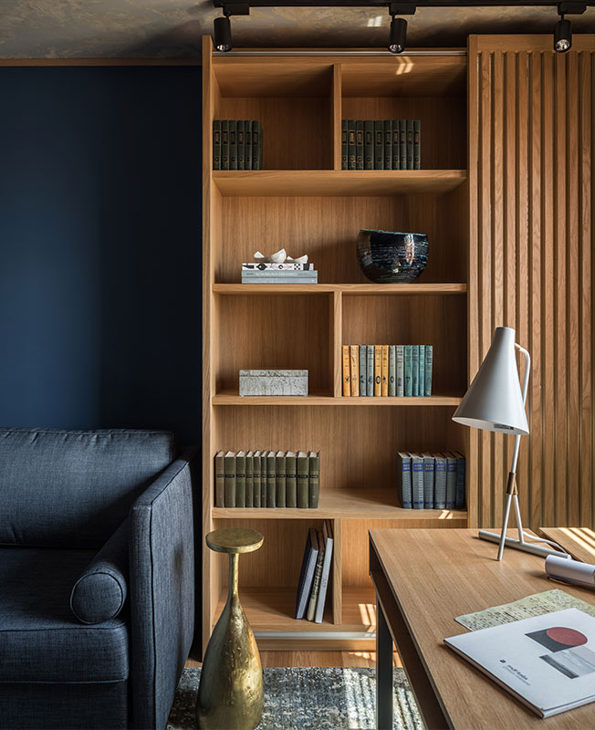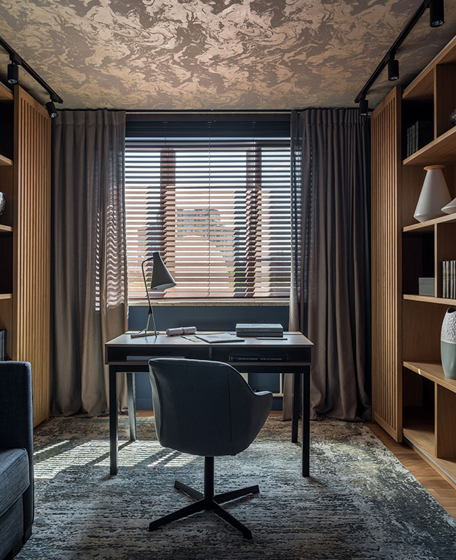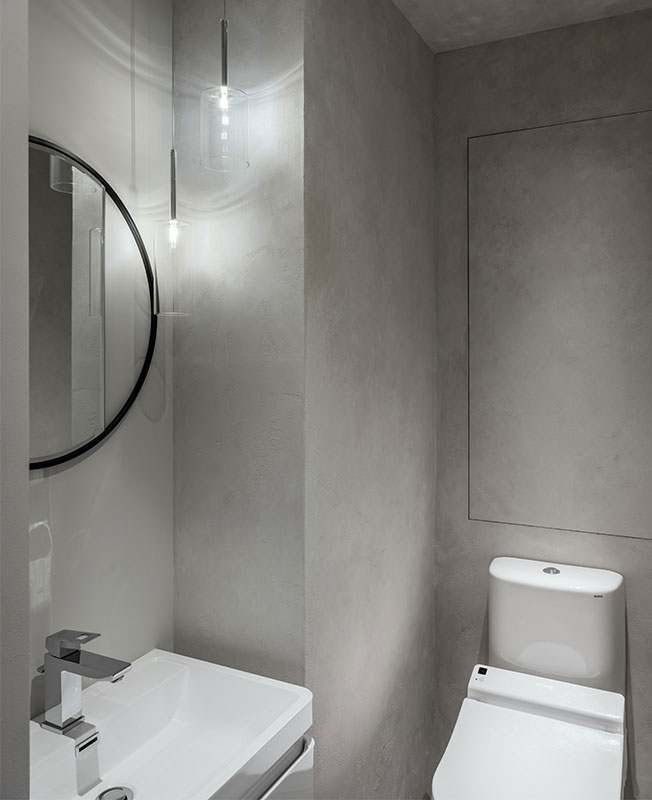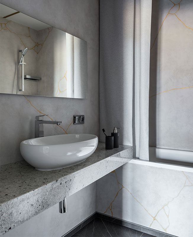 Особой находкой стала декоративная штукатурка, имитирующая старинную технологию реставрации посуды в Японии — кинцуги. Осколки склеивают при помощи лака, смешанного с платиновым, золотым или серебряным порошком. Суть философской основы кинцуги заключается в том, что трещины являются неотъемлемой частью истории объекта, а потому не заслуживают забвения и тем более маскировки. Для ванной комнаты по эскизу дизайнера штукатурка в цвете глины дополнена золотыми «трещинами».