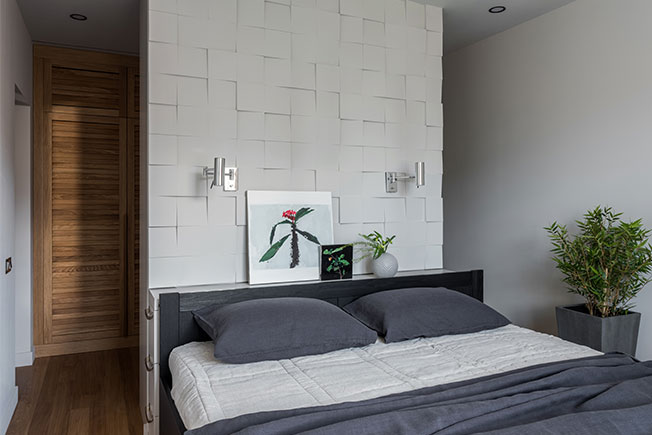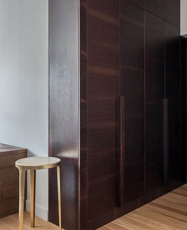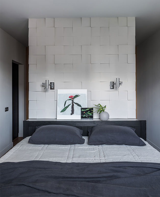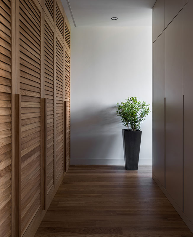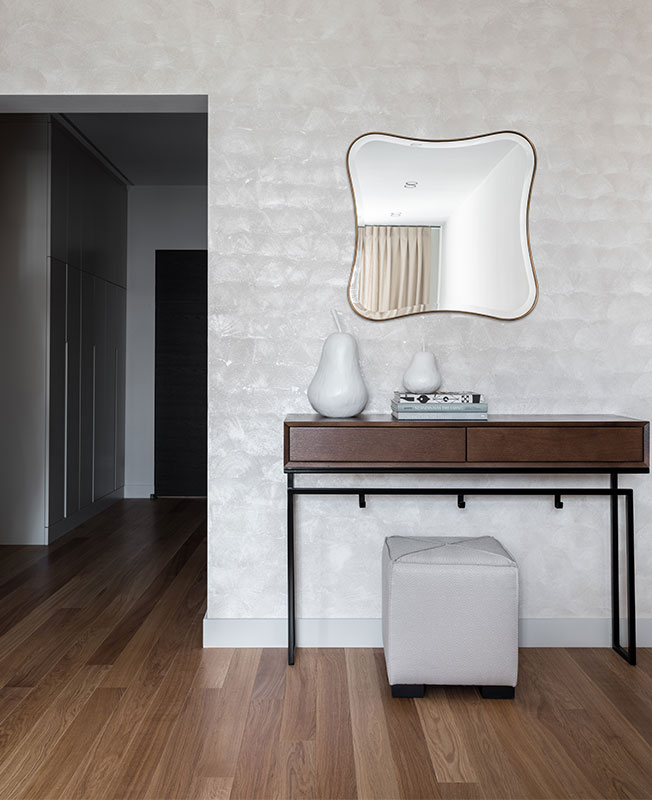 Перепалнировка была минимальной. Все стены в квартире были несущими, за исключением санузлов — дизайнеру удалось выкроить немного пространства для постирочного шкафа и гостевого санузла. В спальне гардеробную от зоны для сна отделили фальш-стеной с гипсовыми панелями.