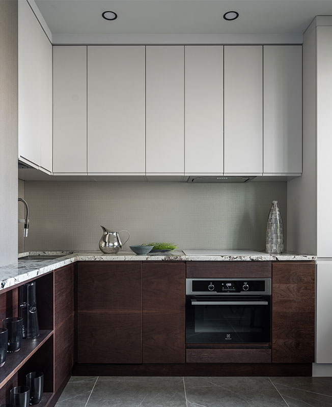 В отделке применили натуральные материалы в духе японского минимализма — дубовый пол из массива, керамогранит с имитацией камня; подоконники, столешницу на кухне и в ванной изготовили из гранита.