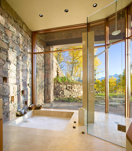 Уровень и размах этих ванных комнат, несомненно, впечатляет, однако, для многих оригиналов и просто ценителей единения с природой идеальная ванная выглядит немного иначе: это комната, в планировке которой задействовано уличное пространство. Речь идет об использовании стеклянных стен и дверей в душе или установке автономной ванны во дворе или в саду, чтобы можно было, купаясь, восхищаться красотой окружающей природы.