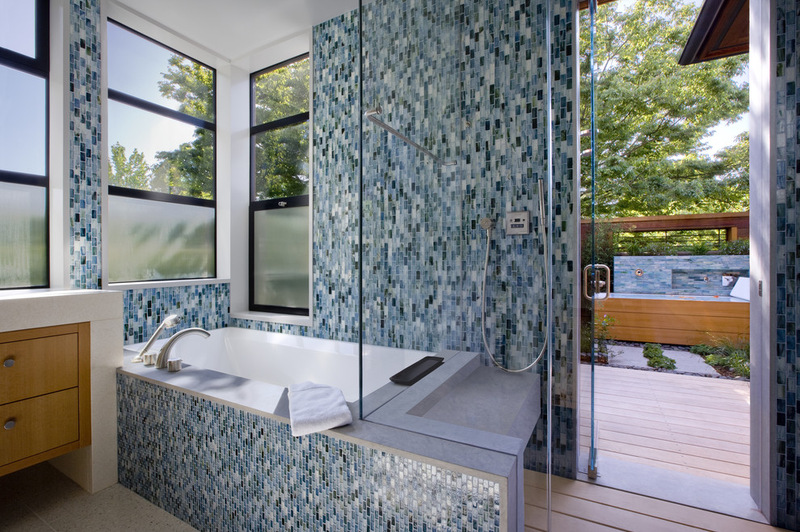 Изюминкой этой ванной комнаты является мозаичная стеклянная плитка (Hokkaido Natural 1/2 - на 1-дюймовом кирпиче от Global Tile Design). Плитка используется во всем помещении ванной, а также за ее пределами, на открытом воздухе, где она представлена в большем размере. Обратите внимание, что внутренние окна застеклены, что обеспечивает купальщикам полную приватность.