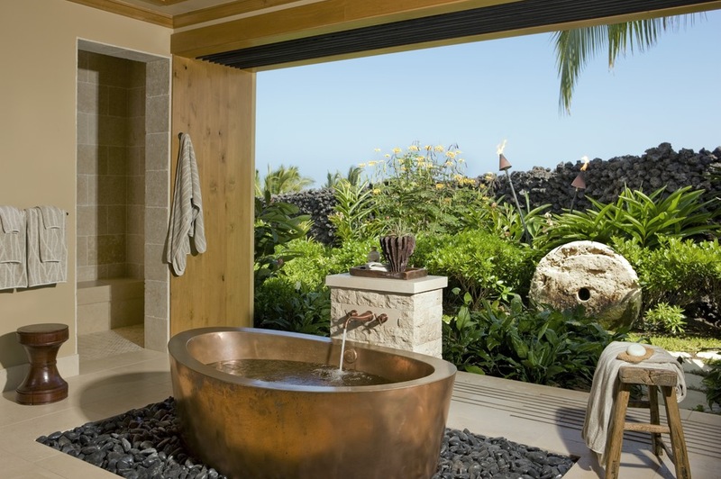 Потрясающая медная ванна, установленная на черных речных камнях, с видом на тропический сад – это ли не предел мечтаний? Следует отметить, что стоит эта роскошь не дешево – цена такой ванны составляет примерно $ 13000. Важный момент: эта ванна от компании Saint Dzier невероятно долго набирается, так что это удовольствие не для нетерпеливых купальщиков!