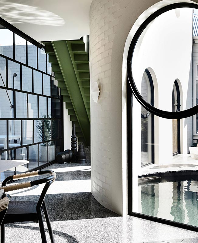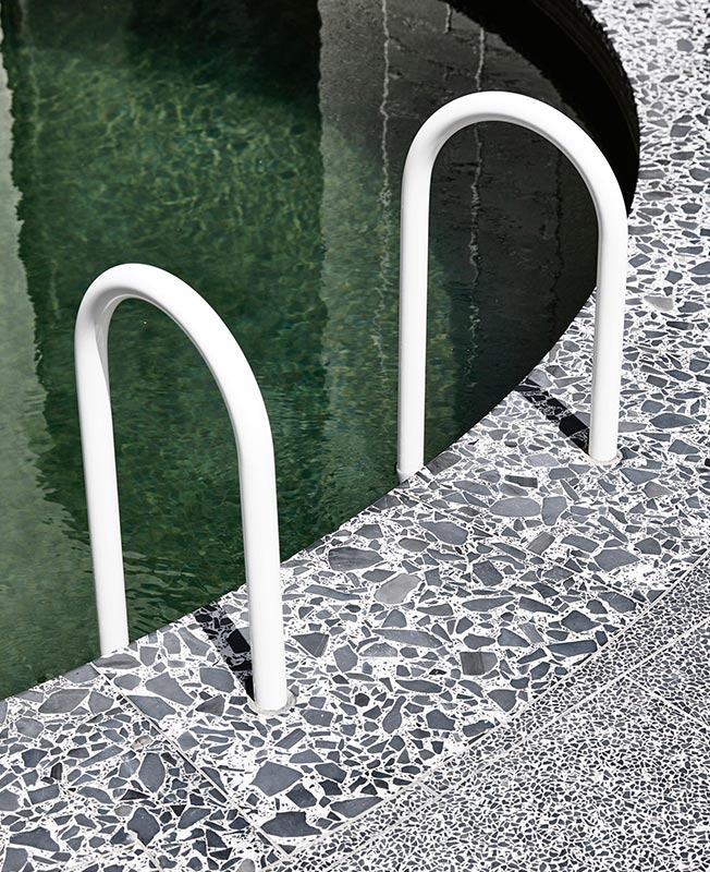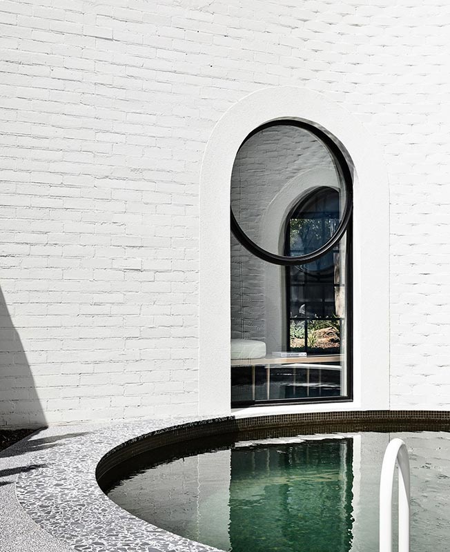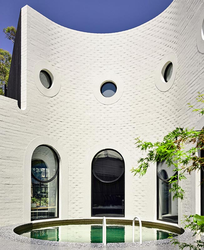 Клиент, которому нужен был семейный дом, настаивал на бассейне как на неотъемлимом элементе архитектуры. «Сложность интеграции бассейнов с каждым годом возрастает из-за новых правил, которые нарушают непосредственную близость к воде. Наш бассейн намеренно бросает вызов привычным понятиям — он круглый, компактный и, одновременно, глубокий, темный», — говорят архитекторы.