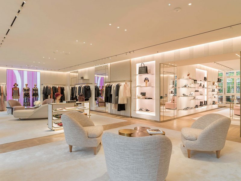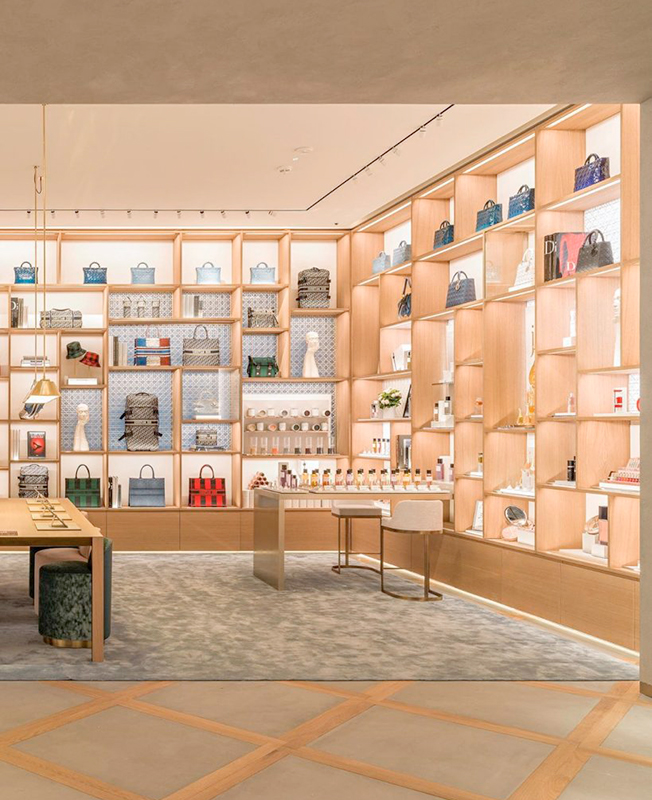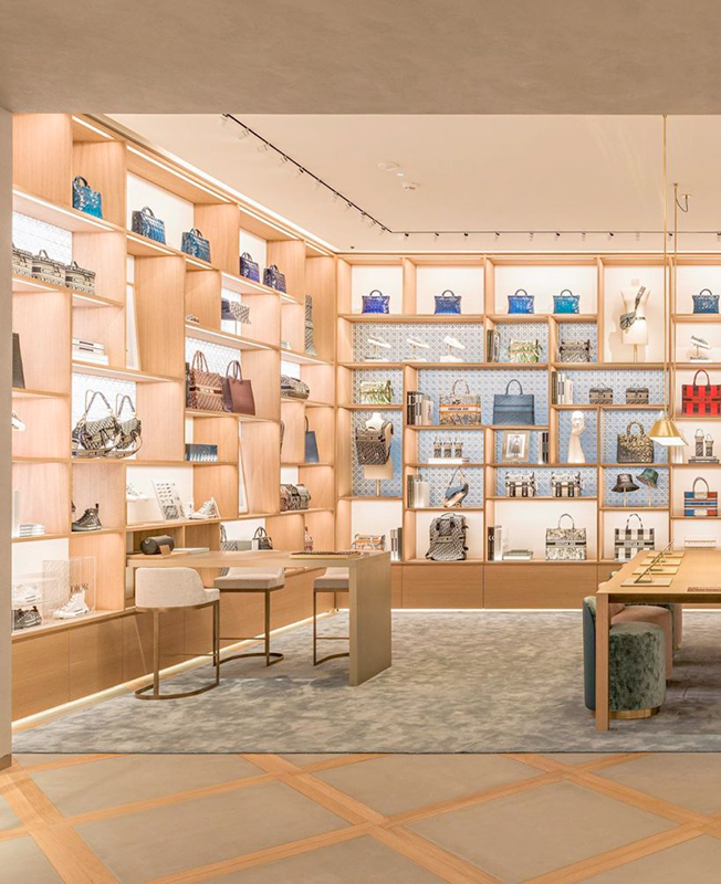 Фоном для одежды, аксессуаров, ювелирных изделий и парфюмерии стала сдержанная теплая палитра, разбавленная золотистыми акцентами. Витрины оформлены знаковой «плетенкой» Дома Dior, к этому же узору отсылает и отделка пола, сочетающая бетон и паркет.