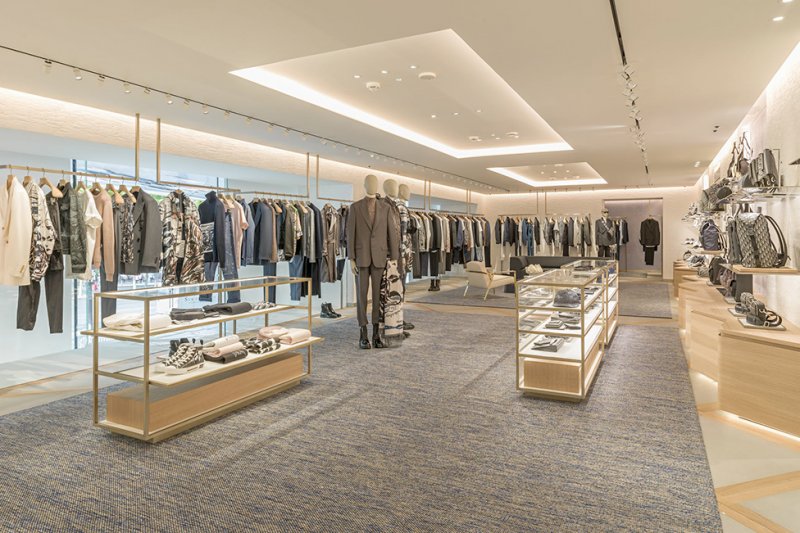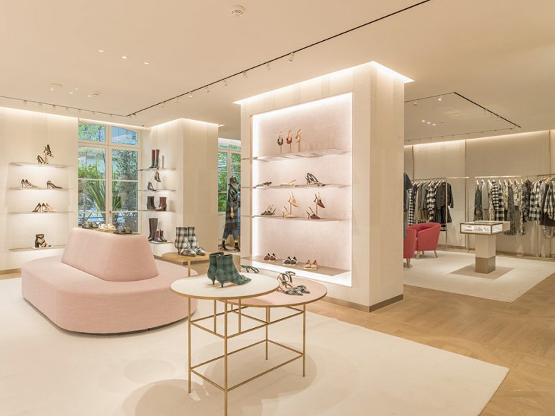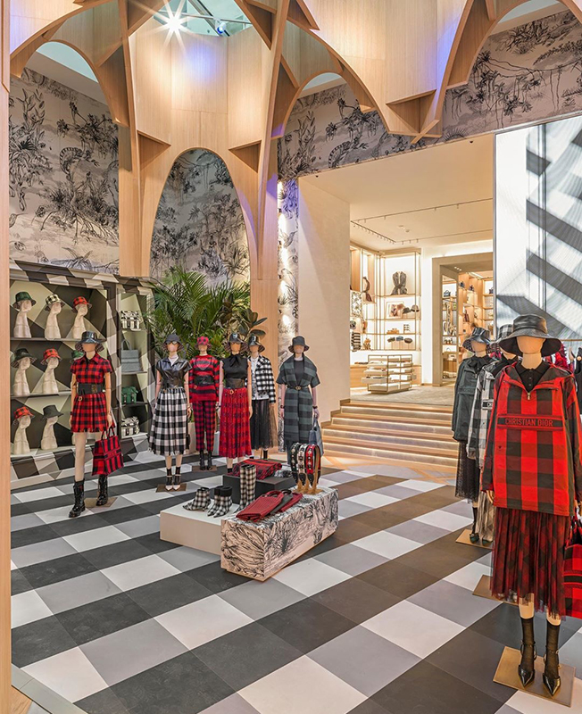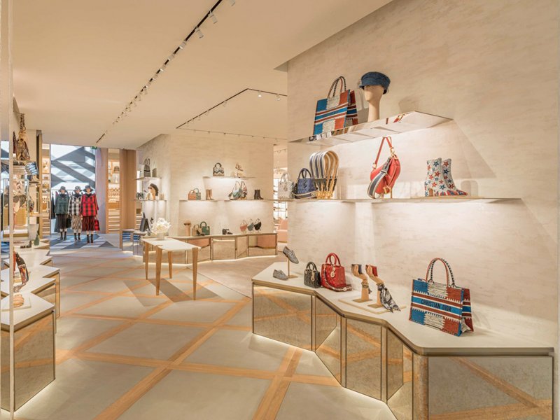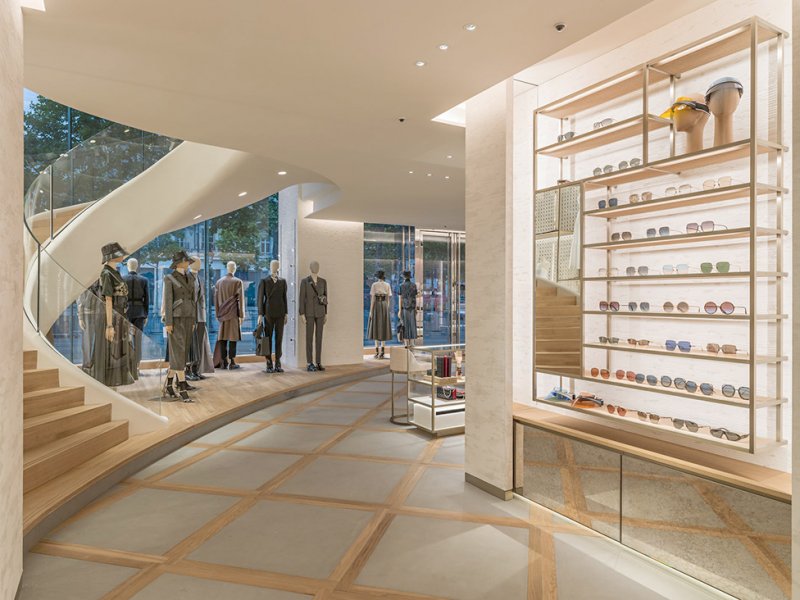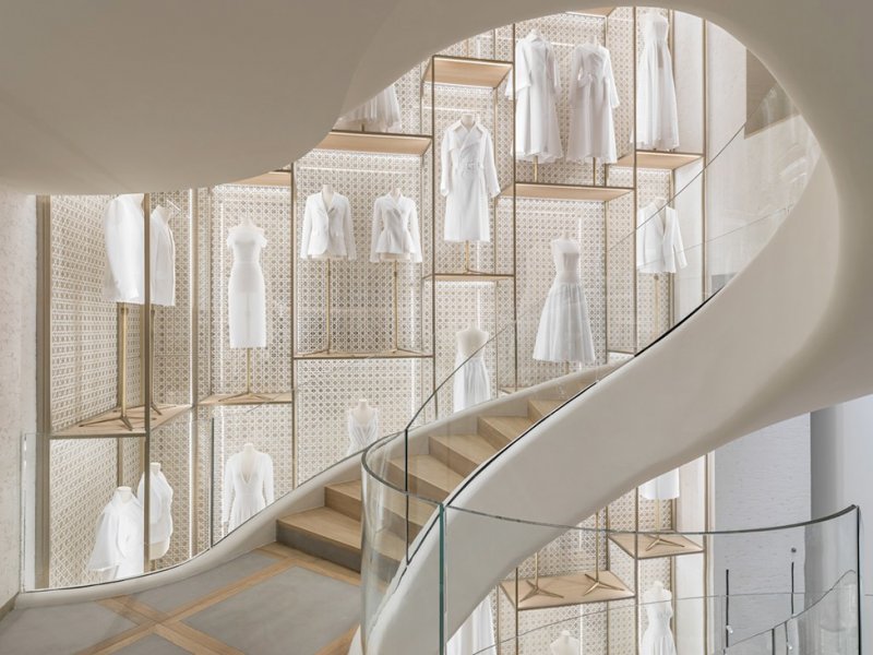 Центральный элемент трехэтажного пространства площадью 890 кв. метров — закрученная лентой лестница со стеклянными перилами, объединяющая три уровня. Первый этаж посвящен женским коллекциям креативного директора бренда Марии Грации Кьюри, второй — работам английского фэшн-дизайнера Кима Джонса. На третьем этаже представлены аксессуары и украшения Dior.