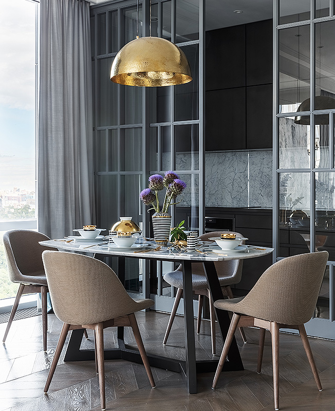 Ольга Энгель. Огромные окна — украшение квартиры в современном доме. Прозрачная перегородка позволяет солнечному свету проникать через гостиную-столовую в кухню. Максимальная высота остекления зрительно приподнимает потолки.