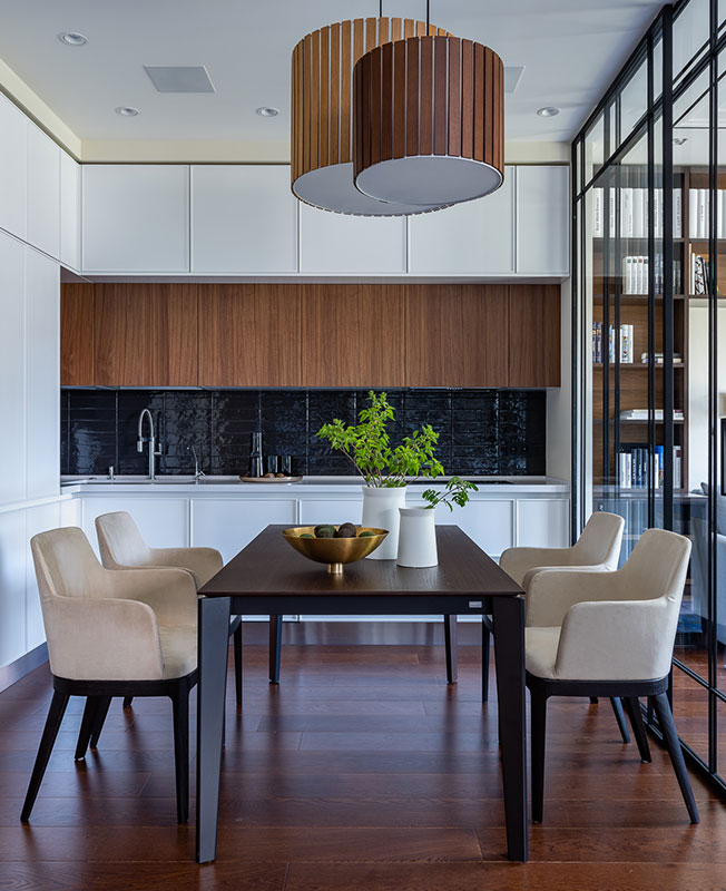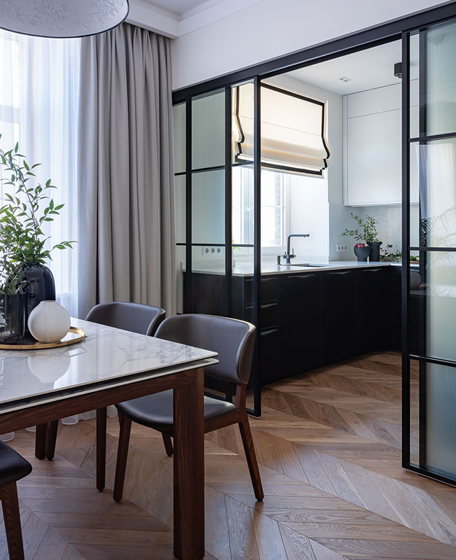 Наталья Соло: перепланировка квартиры для семьи с двумя детьми. Вид из гостиной на кухню. Зоны отделены друг от друга стеклянными сдвижными перегородками. Обеденные стулья, Calligaris.