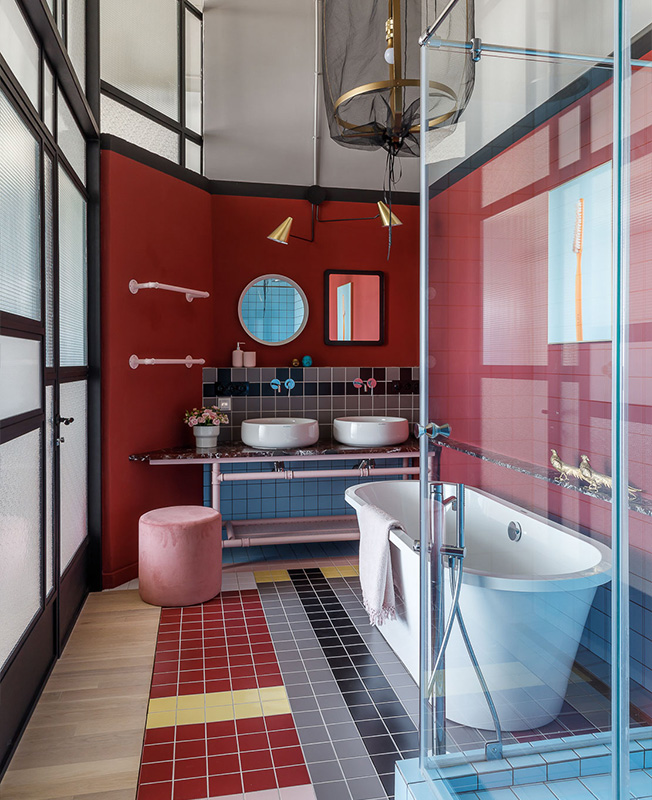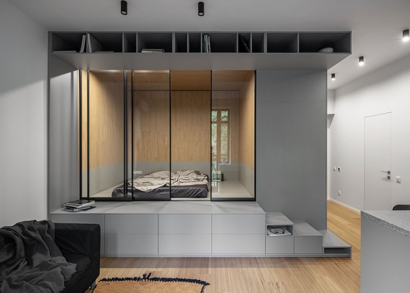 Эмиль Дервиш: ностальгическая квартира для режиссера. Стеклянная перегородка между спальней и ванной обеспечивает доступ дневного света.