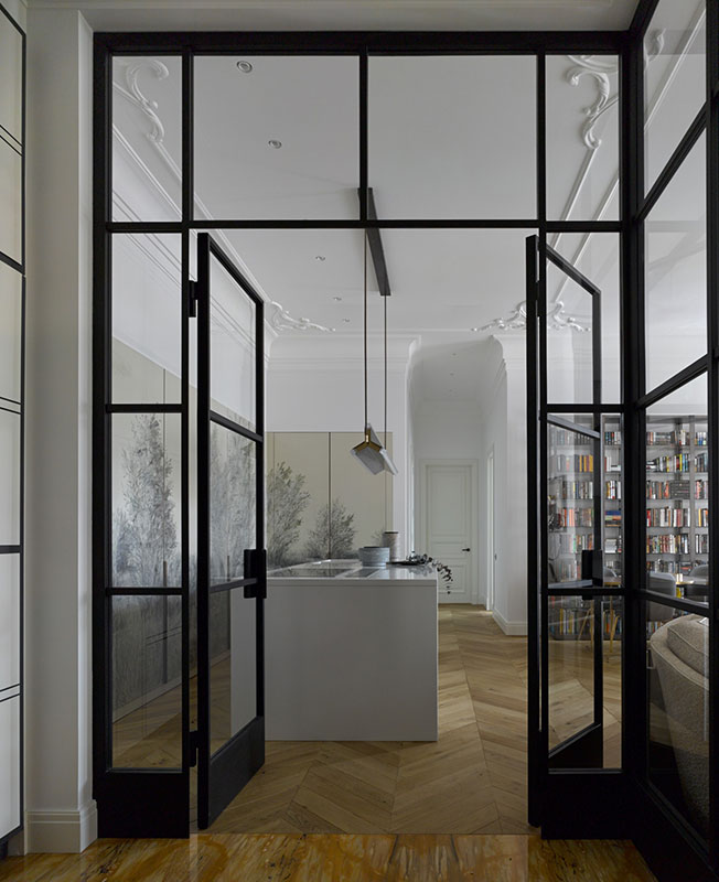 Наталья Соло: перепланировка квартиры для семьи с двумя детьми. Легкими стеклянным перегородкам разграничили пространство кухни-гостиной. Аналогичными — отделили коридор от общественной зоны.