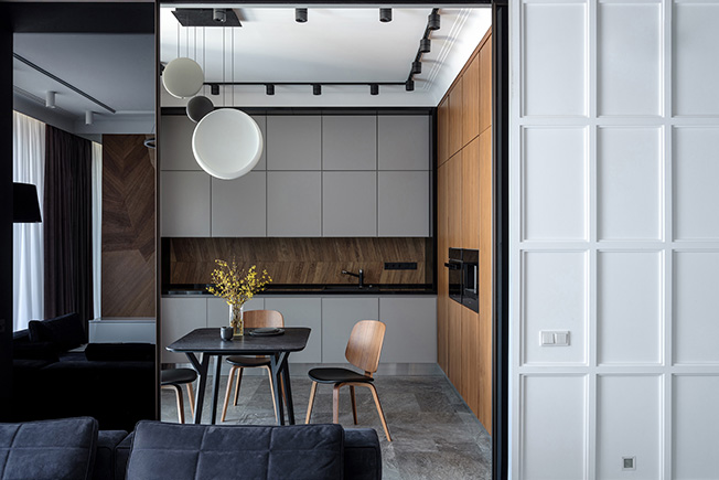 Екатерина Дементьева спроектировала квартиру 75 кв. метров в московском ЖК Redside. Кухня отделена от гостиной раздвижной перегородкой, что позволяет варьировать планировку. Декор стен согласован с членением фасадов кухни Aster Сucine.