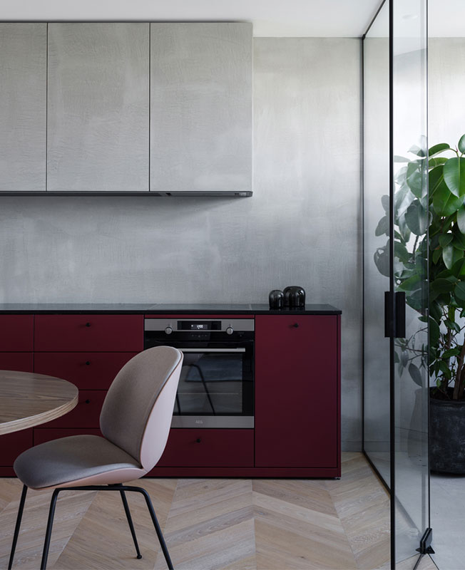 Ирина Марченкова и Мария Земляных оформили столичную квартиру в Доме на Мосфильмовской. Кухня Concrete от Leicht: фасады отделаны нанесенным вручную бетоном. Перегородка — по эскизам авторов проекта.