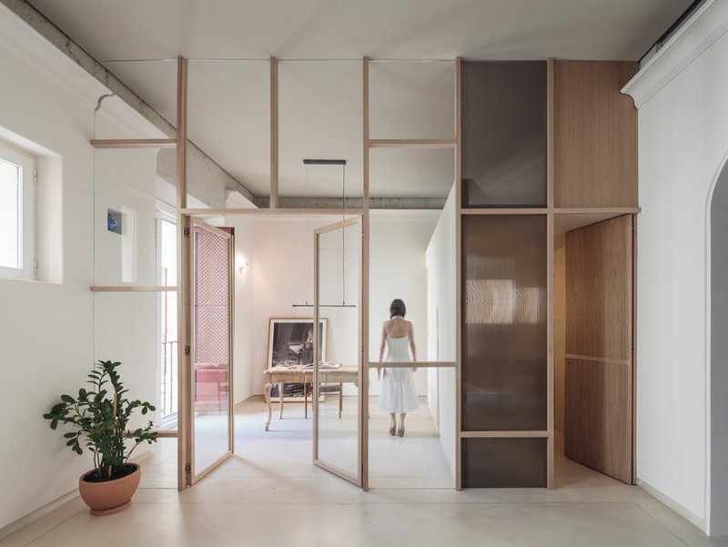 Ideo Arquitectura: квартира в испанском дворце. Заказчик просил выделить комнату, где его дети могли бы заниматься и делать уроки. Оно отделено от зоны гостиной-столовой тонким экраном из стекла и древесины бука. Перегородка, по мнению авторов проекта, современно выглядит, а также пропускает свет и не лишает комнаты ощущения простора.