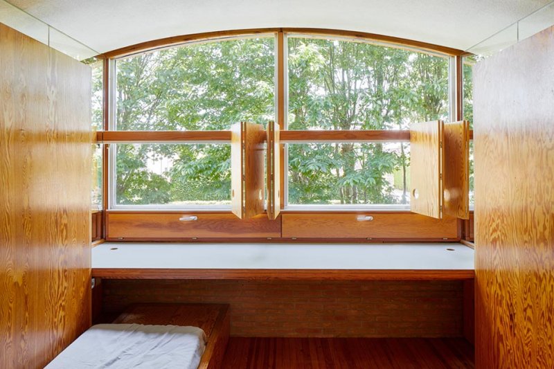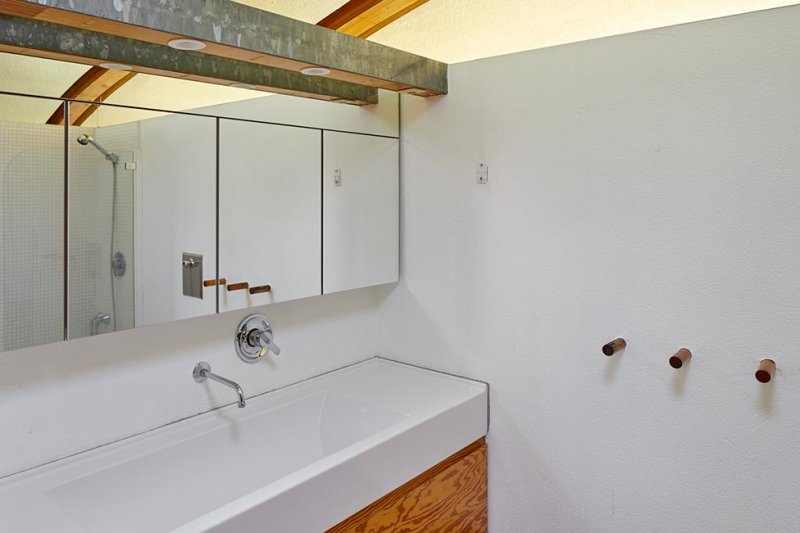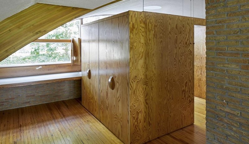 Многие встроенные и стационарные шкафы, спроектированные архитектором, сделаны из прочной орегонской сосны. Помимо систем хранения здесь почти все разработано Верпланкеном — ванна комната, умывальники и туалеты, потолочные светильники и мебель. Дом источает свободу и солидарность с природой, органичной частью которой хочет стать человек.