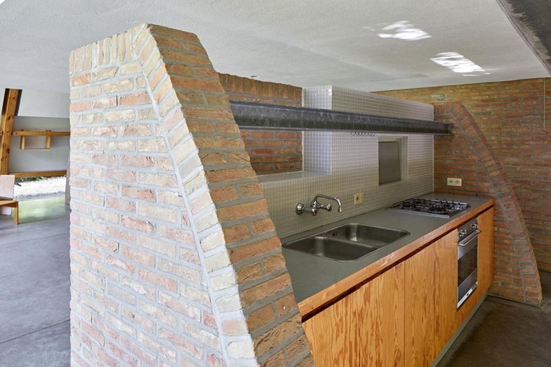 Куда бы вы ни пошли, везде есть открытое пространство и воздух, всегда есть функциональные вмешательства, которые тонко разделяют интерьер и придают особую уютную индивидуальность. Например, низкая кирпичная стена отделяет кухонный блок от гостиной. Труба отопления имеет вид камина.
